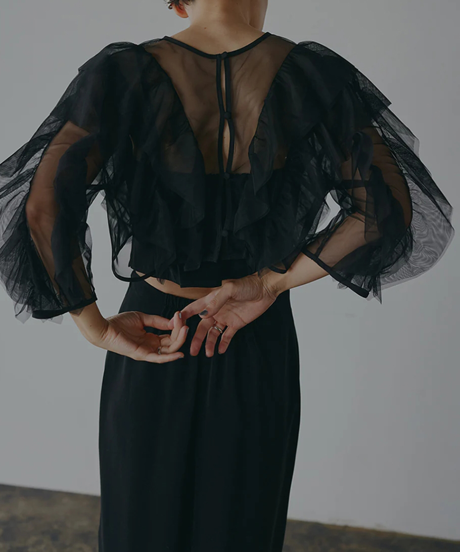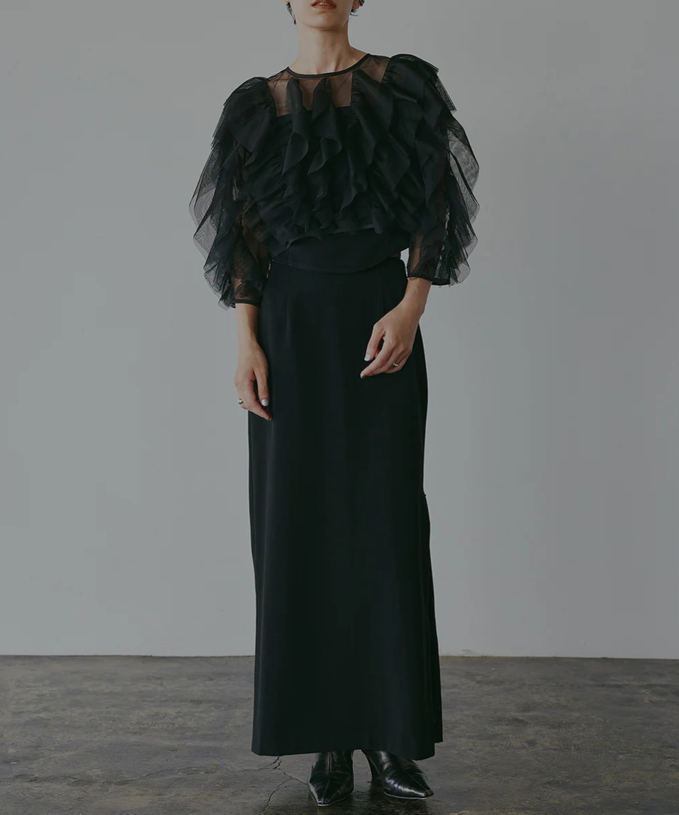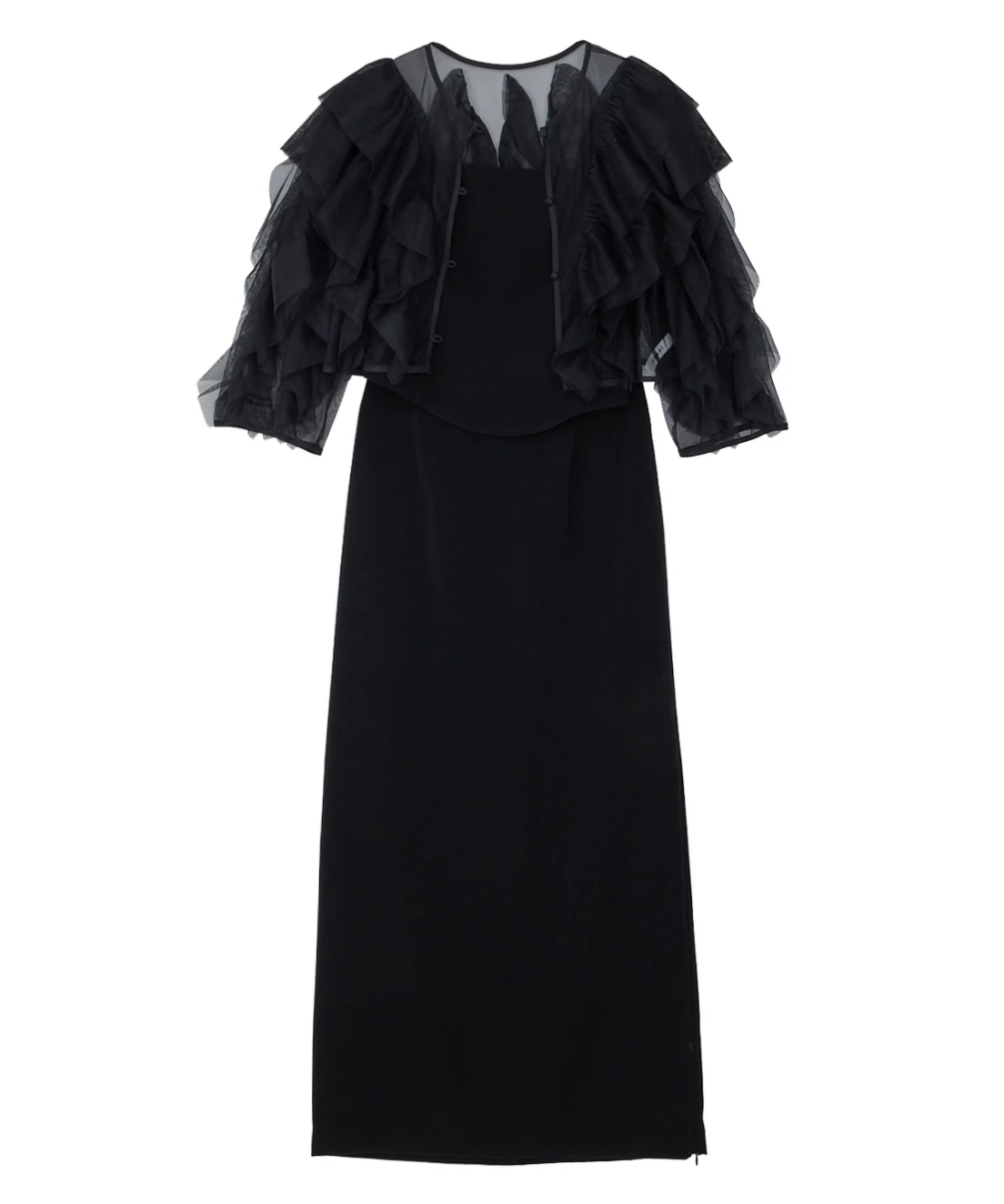 チュール素材のボレロ、キャミトップ、Iラインスカートの3ピースのドレス。
