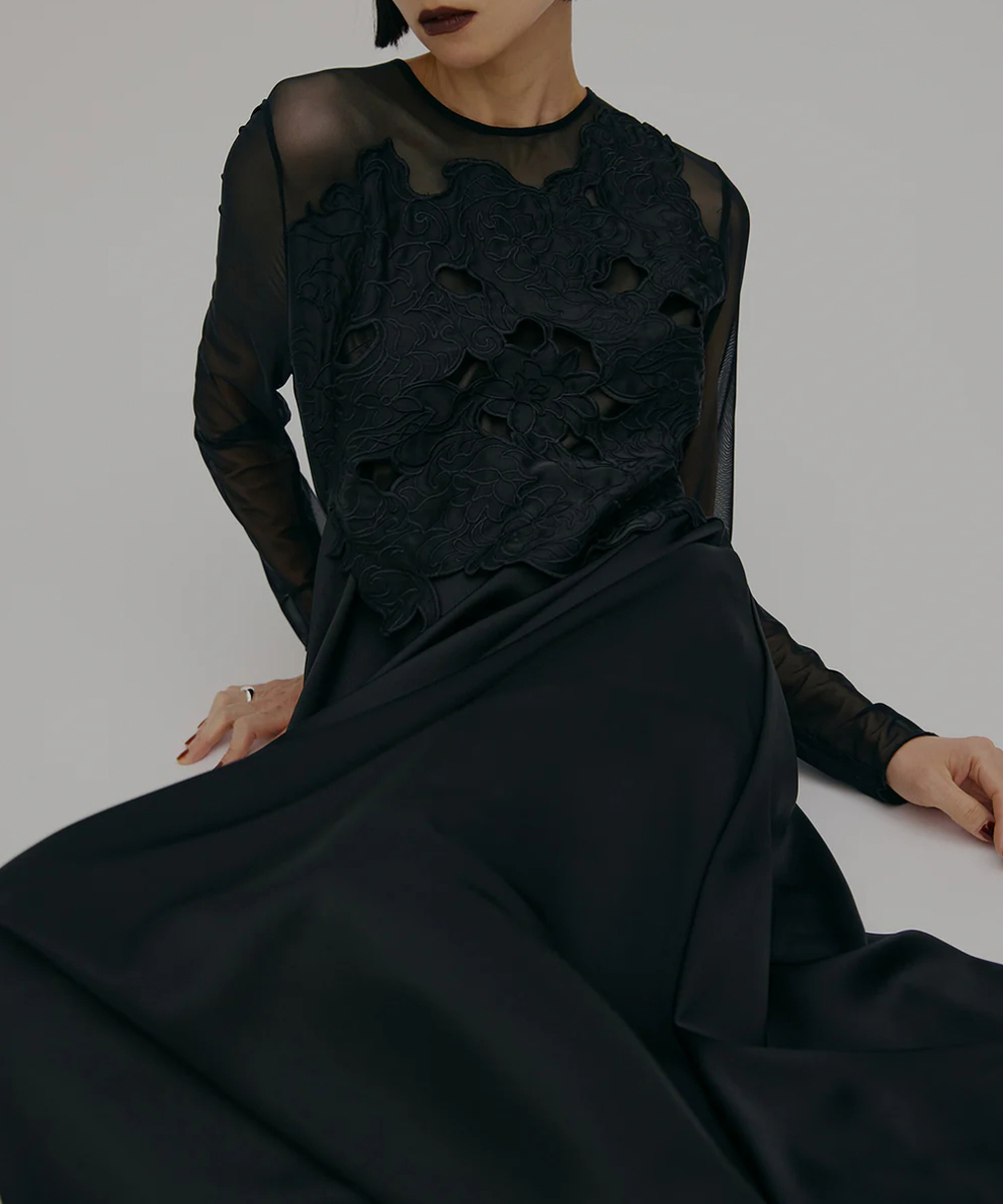 大胆なオリジナル刺繡が施されたアシンメトリー柄のドレス。