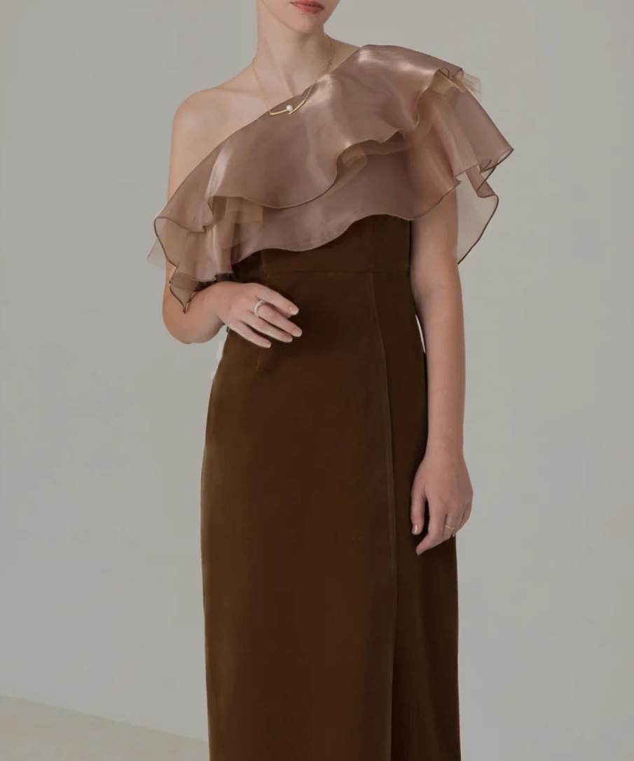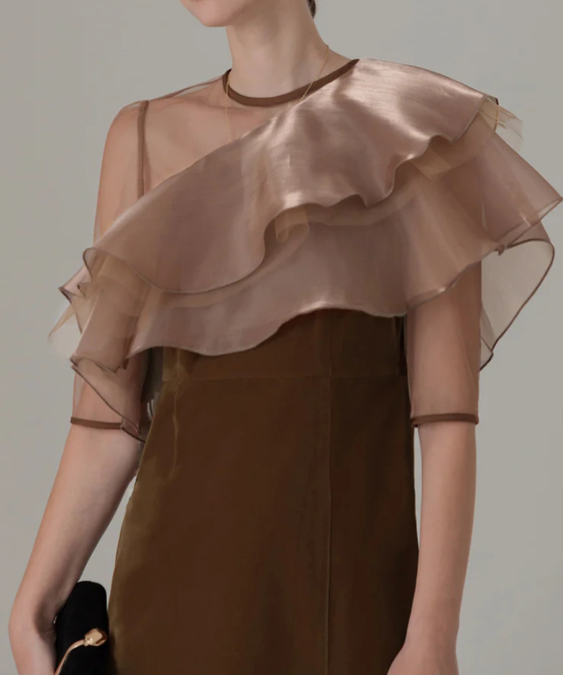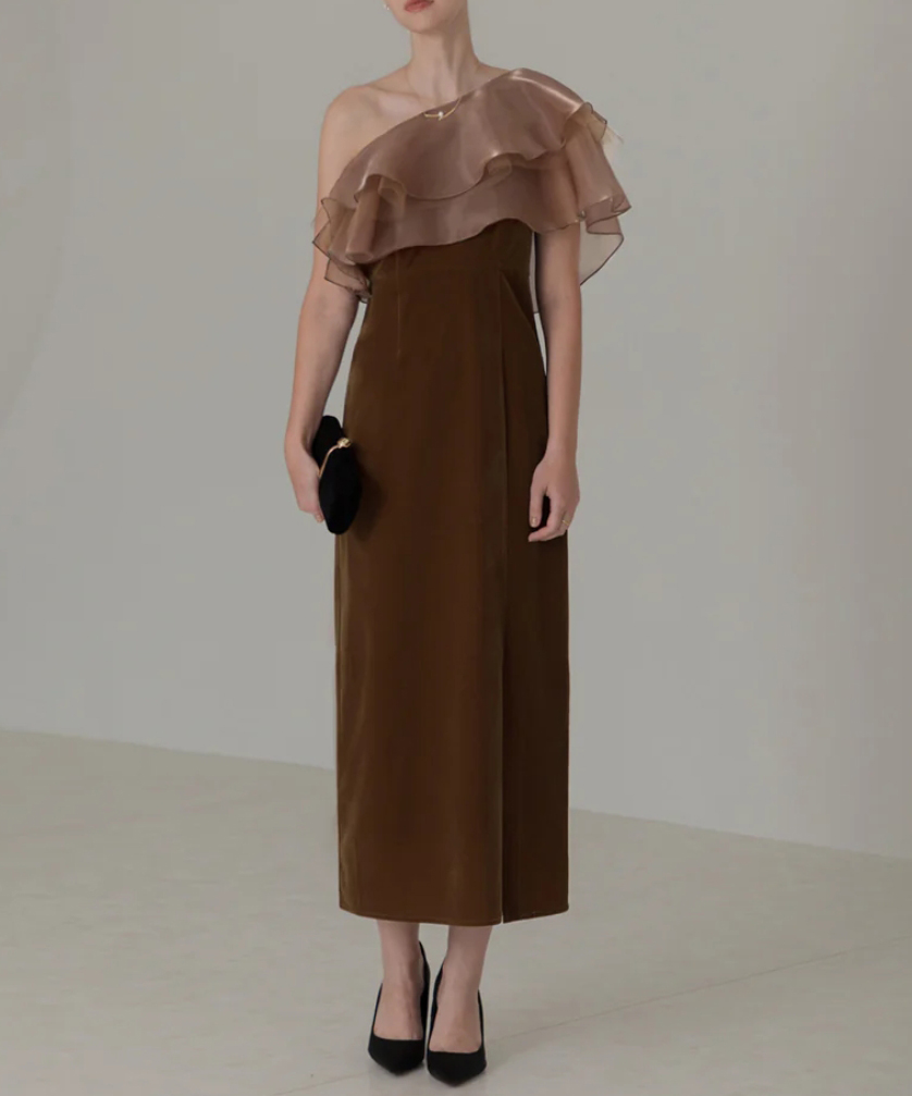 光沢感のあるオーガンジーとチュール素材のティアードフリルがエレガントさを引き立て、インナートップスなしで着るとワンショルダーの上品な肌見せが楽しめます。