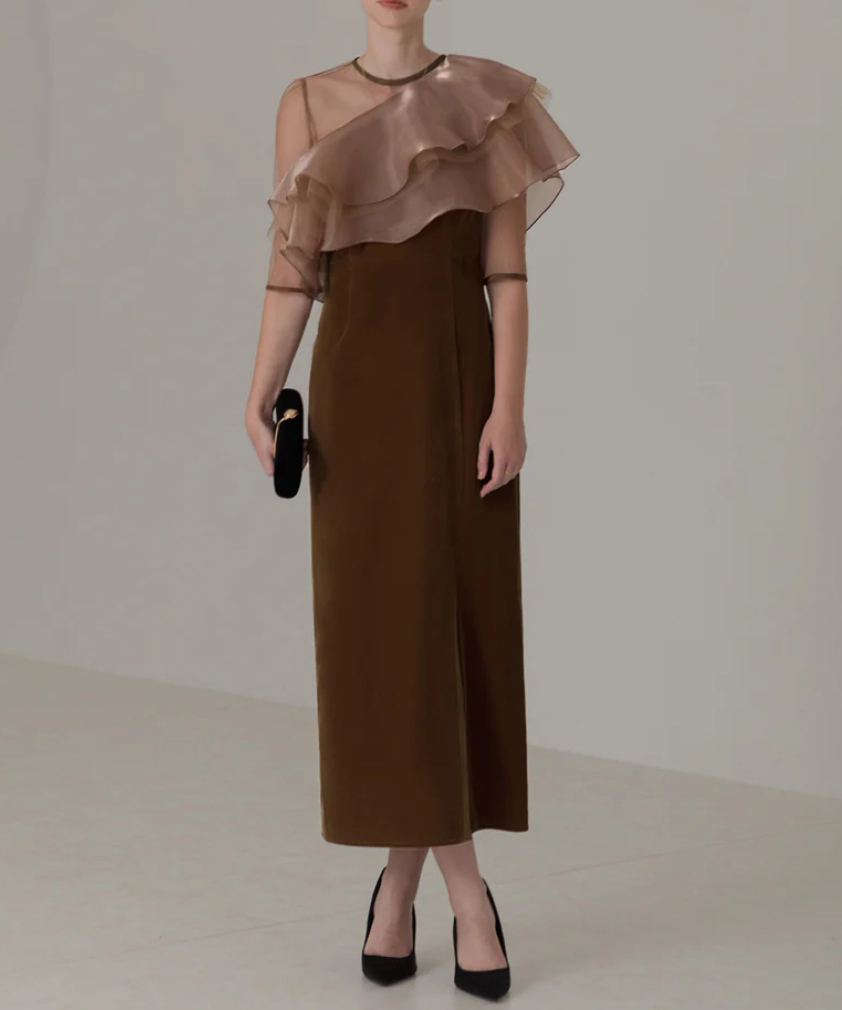 光沢感のあるオーガンジーとチュール素材のティアードフリルがエレガントさを引き立て、インナートップスなしで着るとワンショルダーの上品な肌見せが楽しめます。