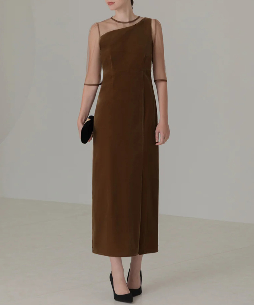 ベロア生地のワンピース部分は秋冬にぴったりのシーズン感を演出し、Iラインシルエットでバランスよく美しい印象に。