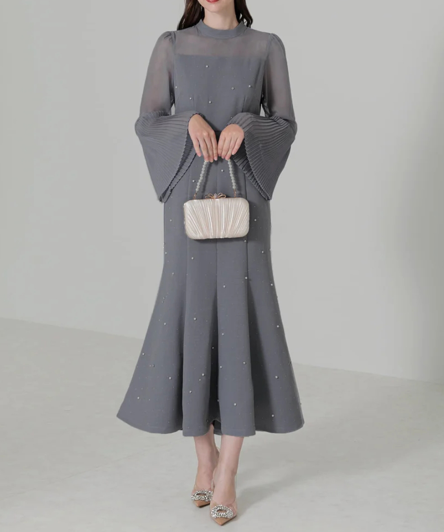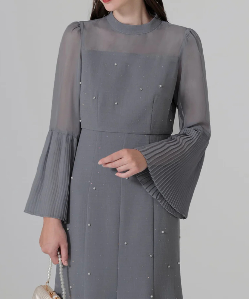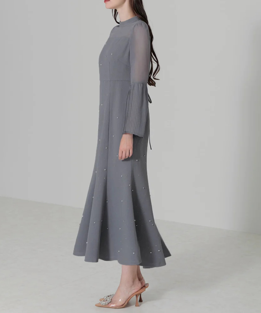 華やかにきらめくパールやビジューをふんだんに散りばめたフェミニンロングドレス。