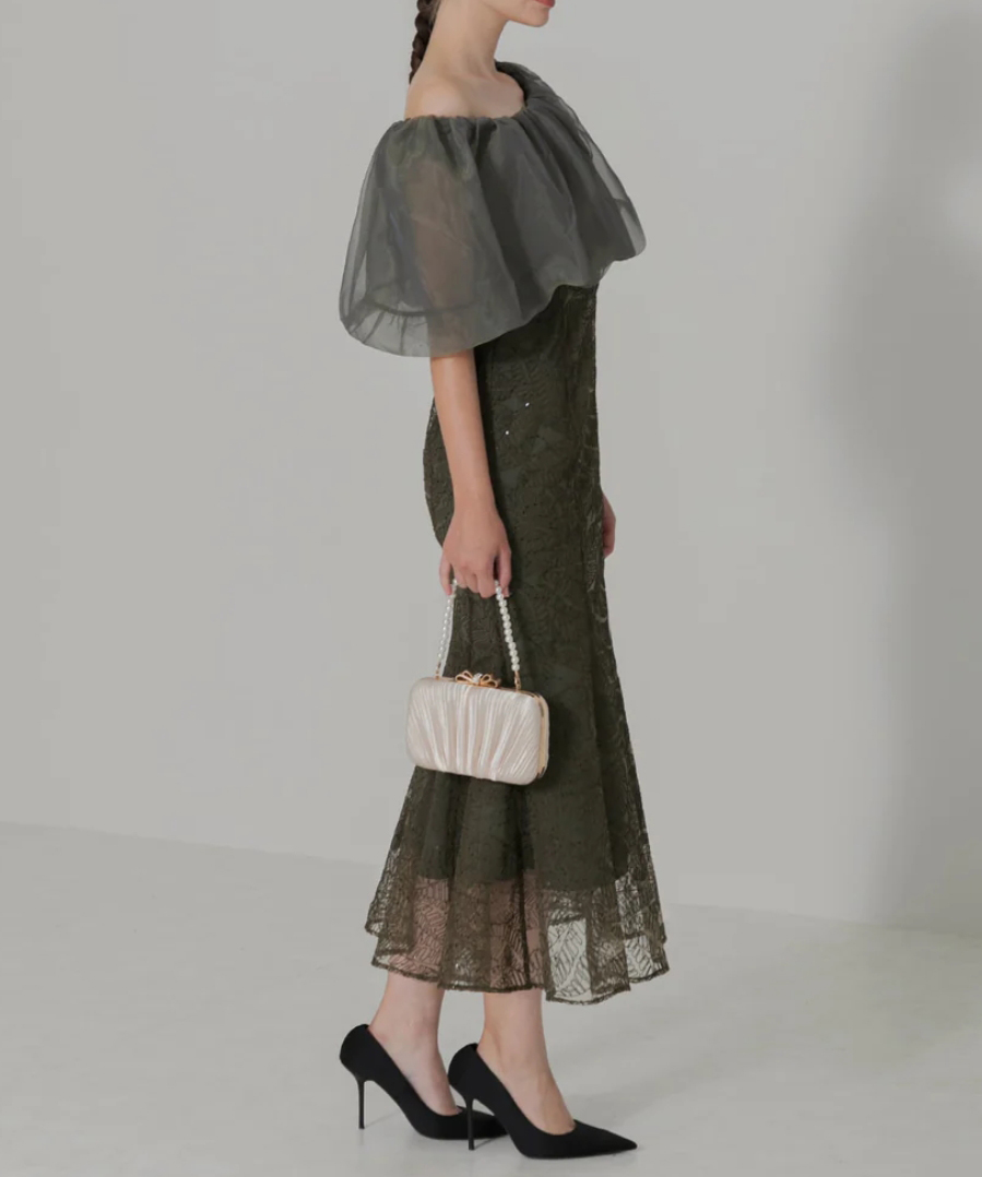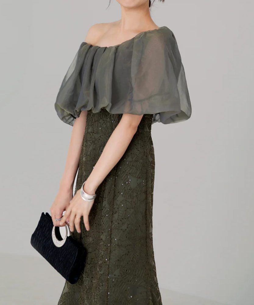 オフショルダーかパフスリーブか着方を選べるデコルテアレンジ力抜群のマーメイドシルエットロング丈ドレスワンピース。