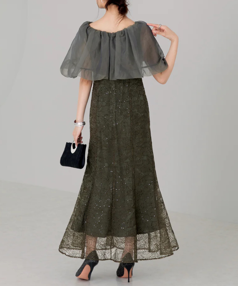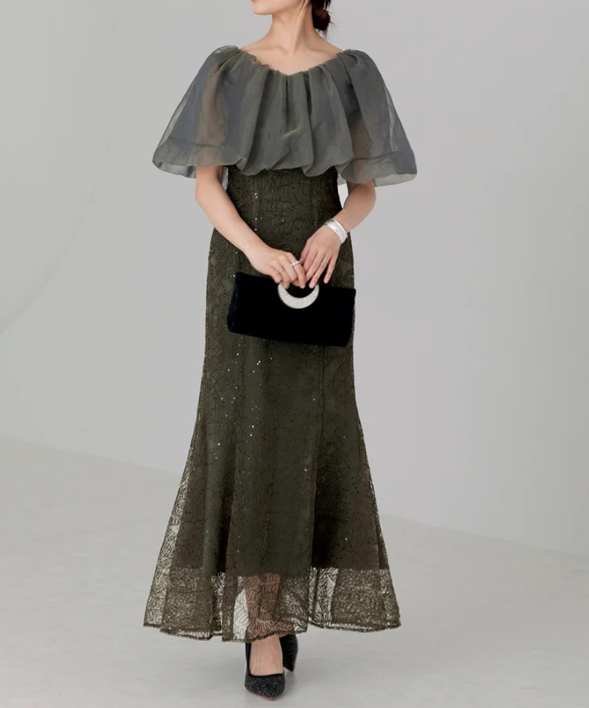 オフショルダーかパフスリーブか着方を選べるデコルテアレンジ力抜群のマーメイドシルエットロング丈ドレスワンピース。