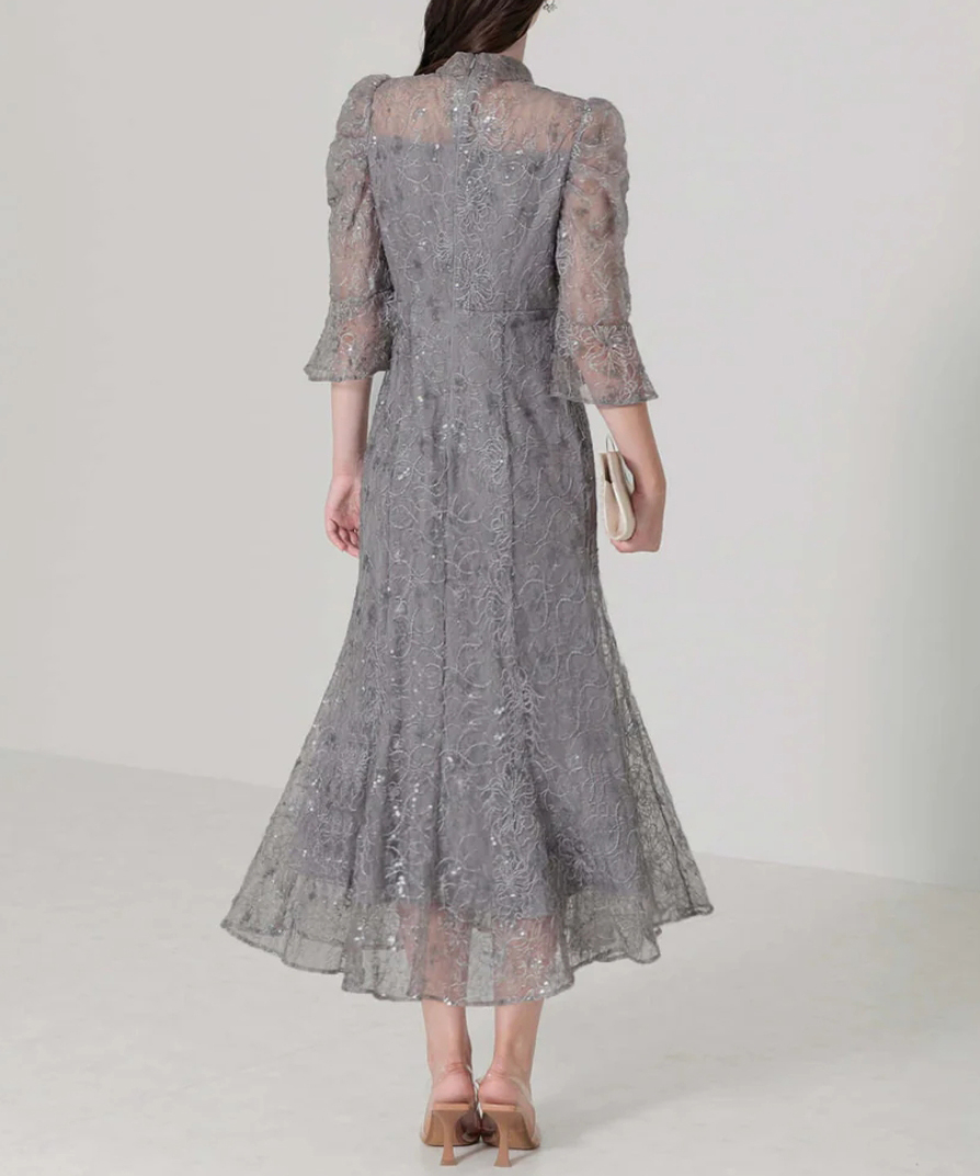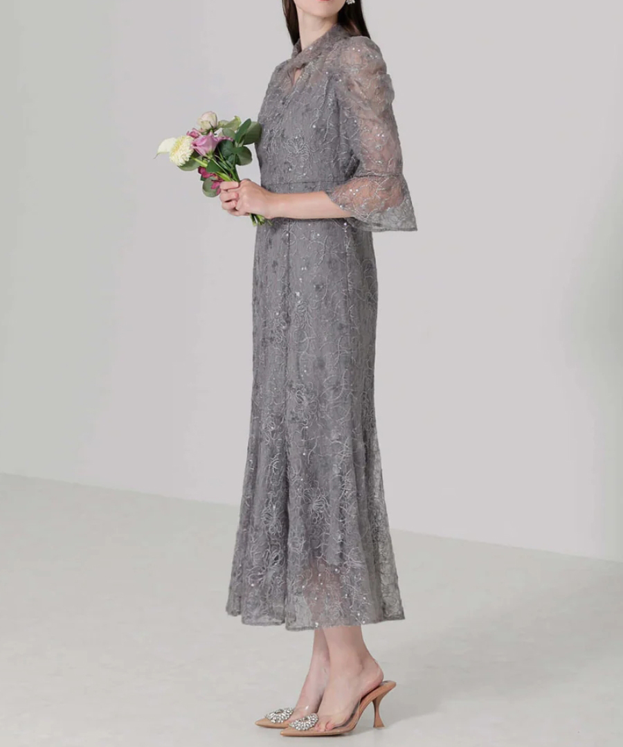 繊細な花柄刺繍にスパンコールを散りばめ、フェミニンかつ輝きを備えたマーメイドドレス。