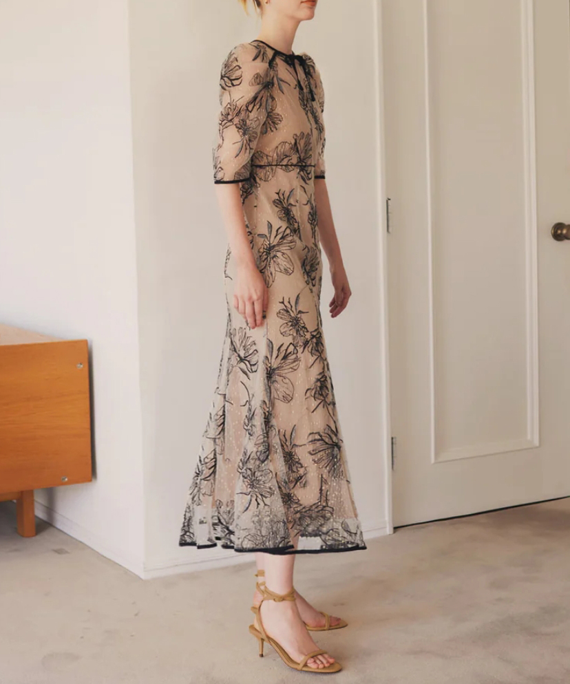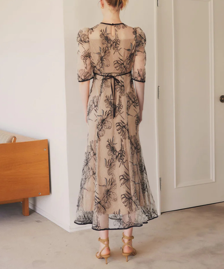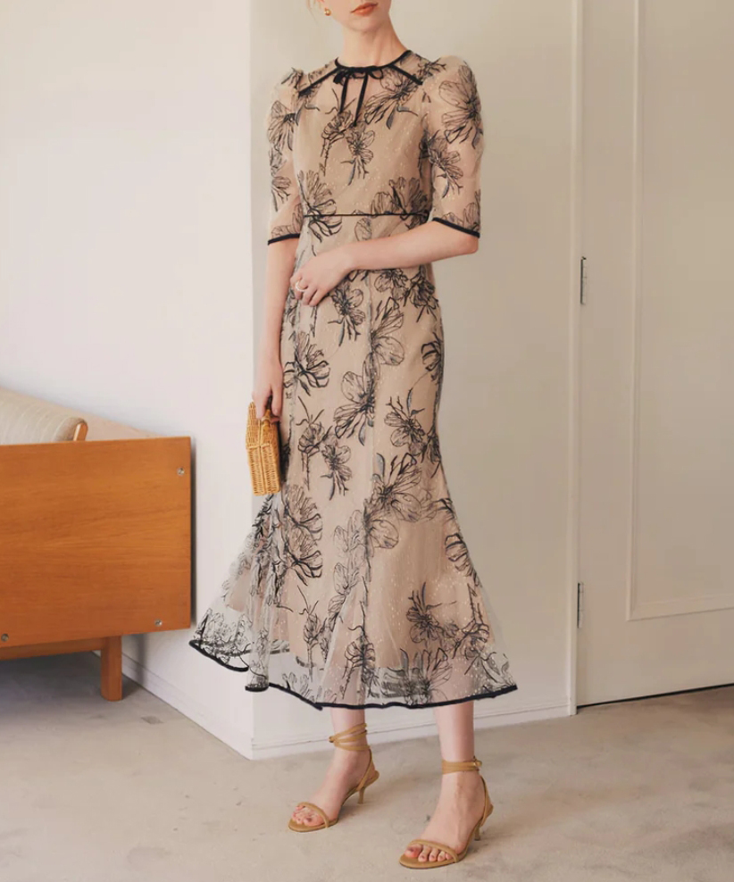オリジナルの花柄刺繍がキュートなマーメイドワンピースドレス。