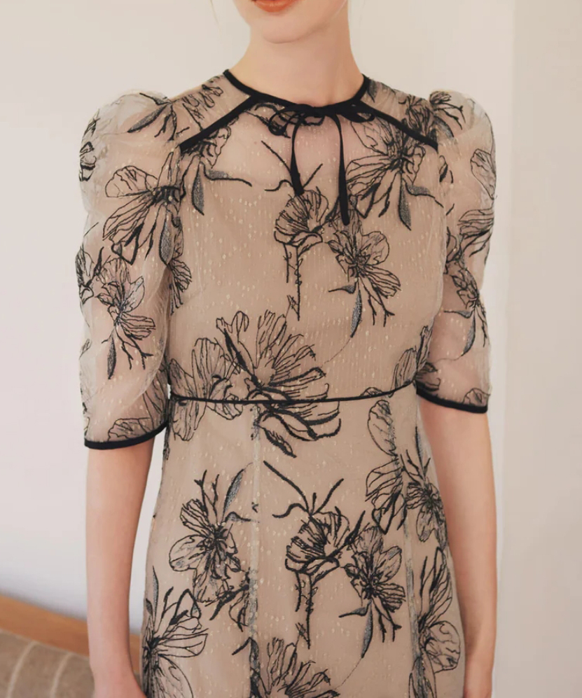 花柄刺繍とブラックのラインでシルエットにメリハリをつけ、シャープな印象を与えます。