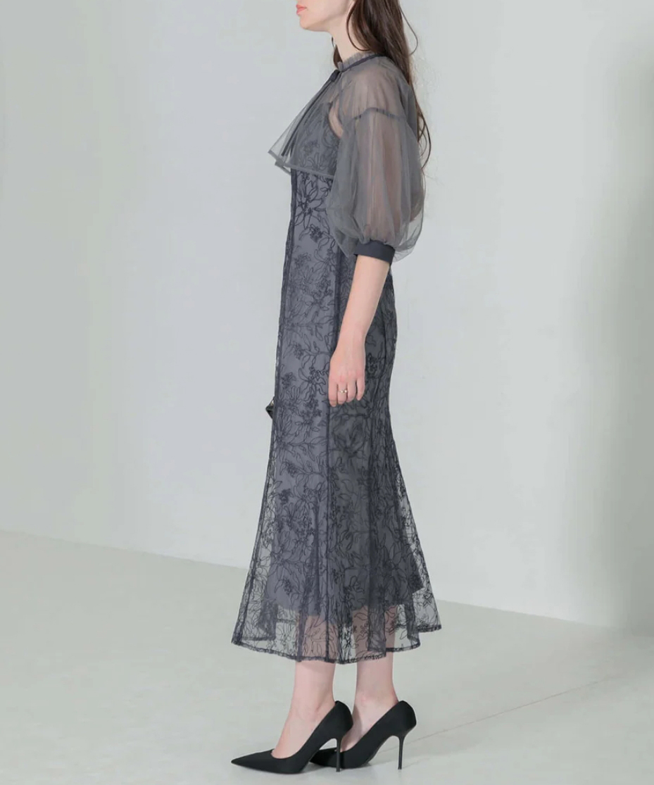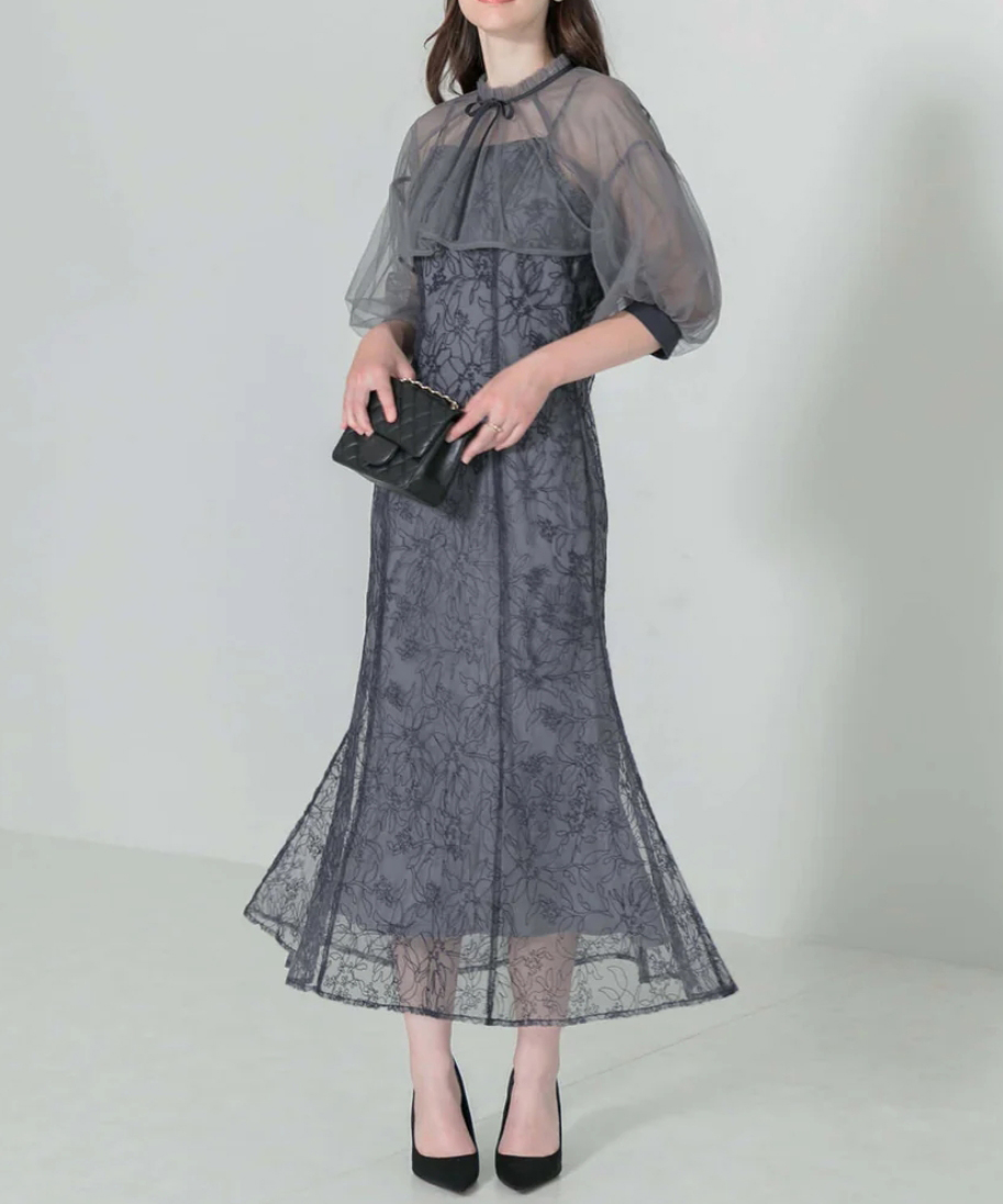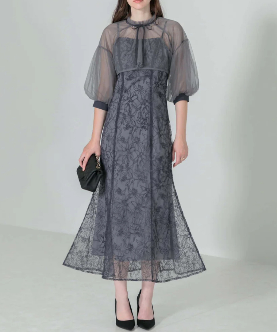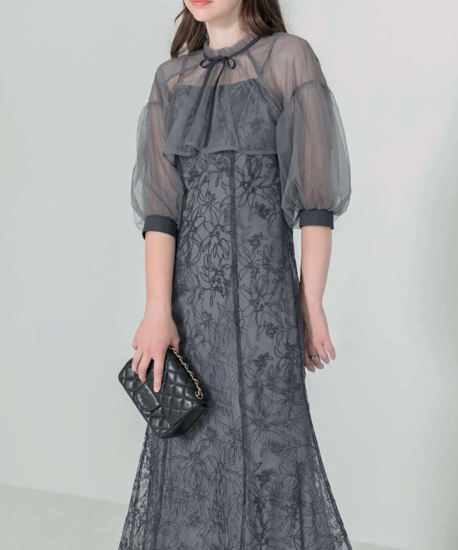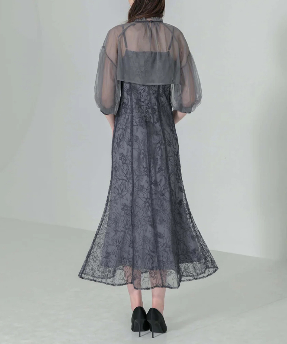 透け感とパフスリーブが特徴のボレロ×ラインアートの線画刺繍が清楚感溢れるロングドレス。