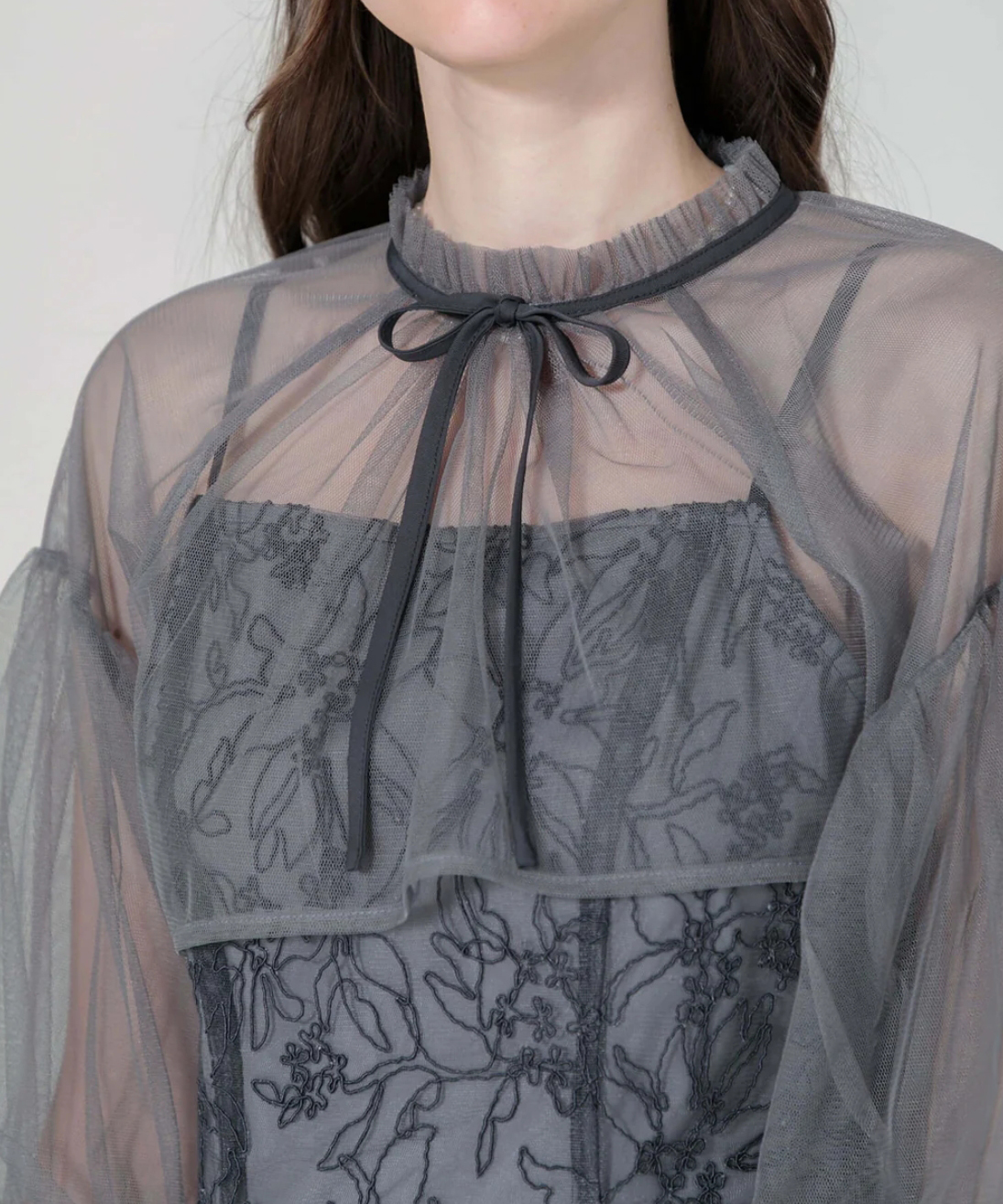 ボレロはシアーレースの透け感と首元のリボンで、華やかで愛らしい雰囲気を演出。