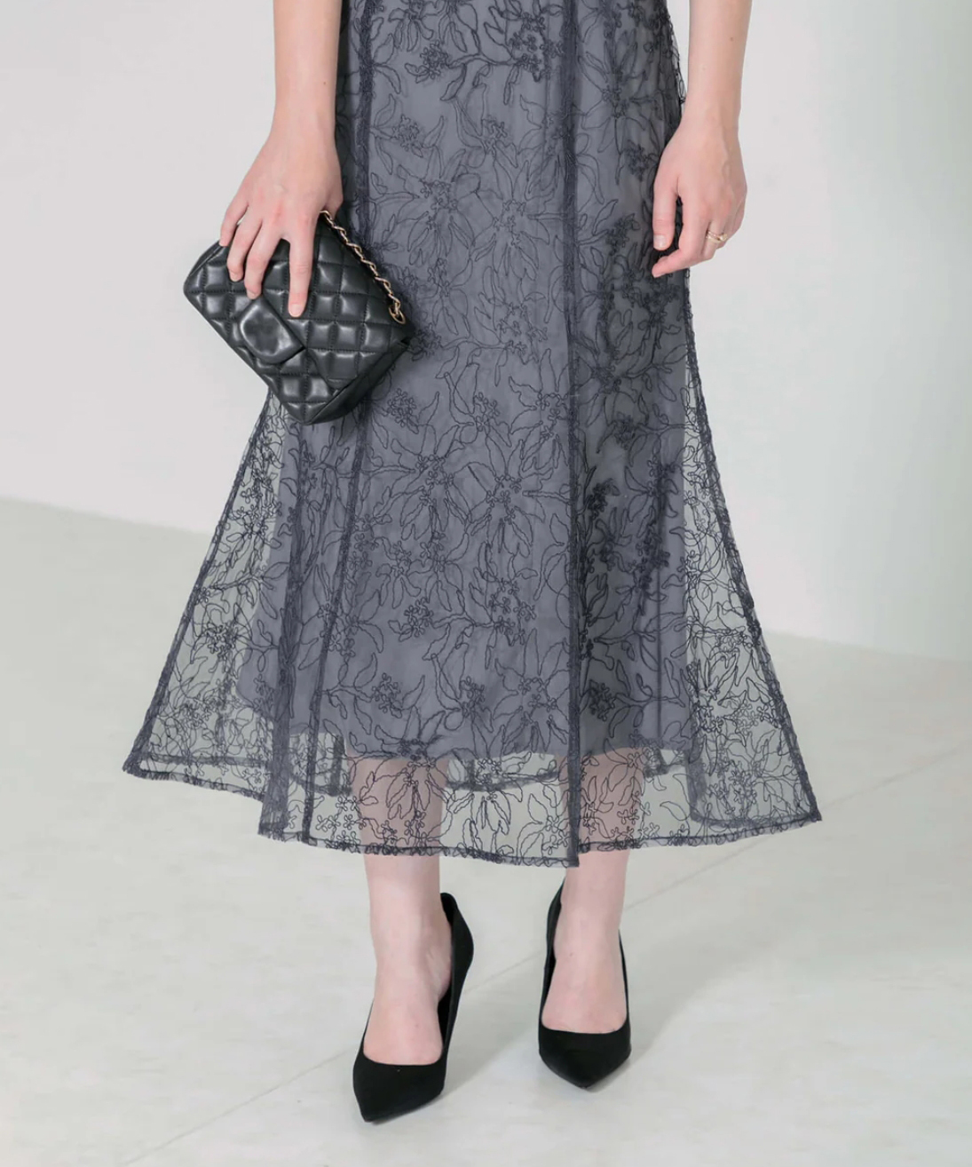 キャミワンピースには線画刺繍を施したレースを重ね、ラグジュアリーな印象を与えます。
