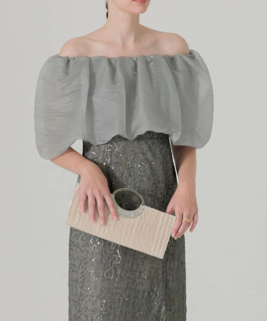 オフショルダーでデコルテを美しく見せ、パフスリーブで二の腕をカバーできる2WAY仕様のアイテムです。