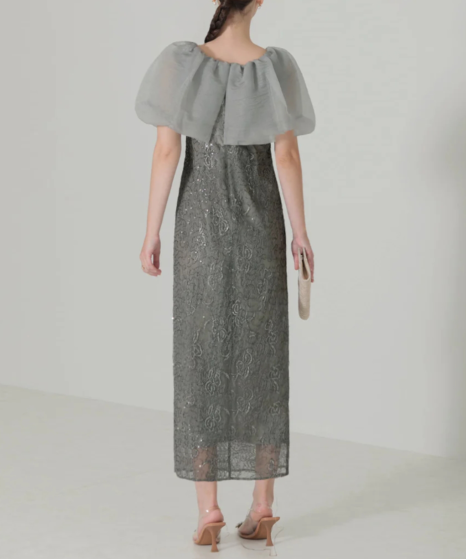 華やかな花柄ワンピースとスパンコール刺繍がデザインの魅力を引き立て、袖部分はオーガンジーレース素材で仕上げ、肩回りを華奢に見せるボリューム感を抑えています。
