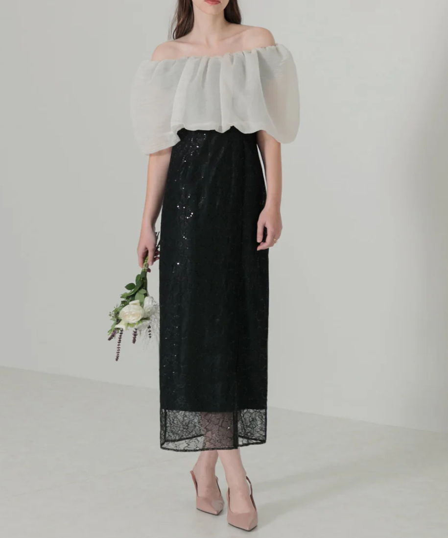 オフショルダーかパフスリーブか着方を選べるデコルテアレンジ力抜群のドレス。