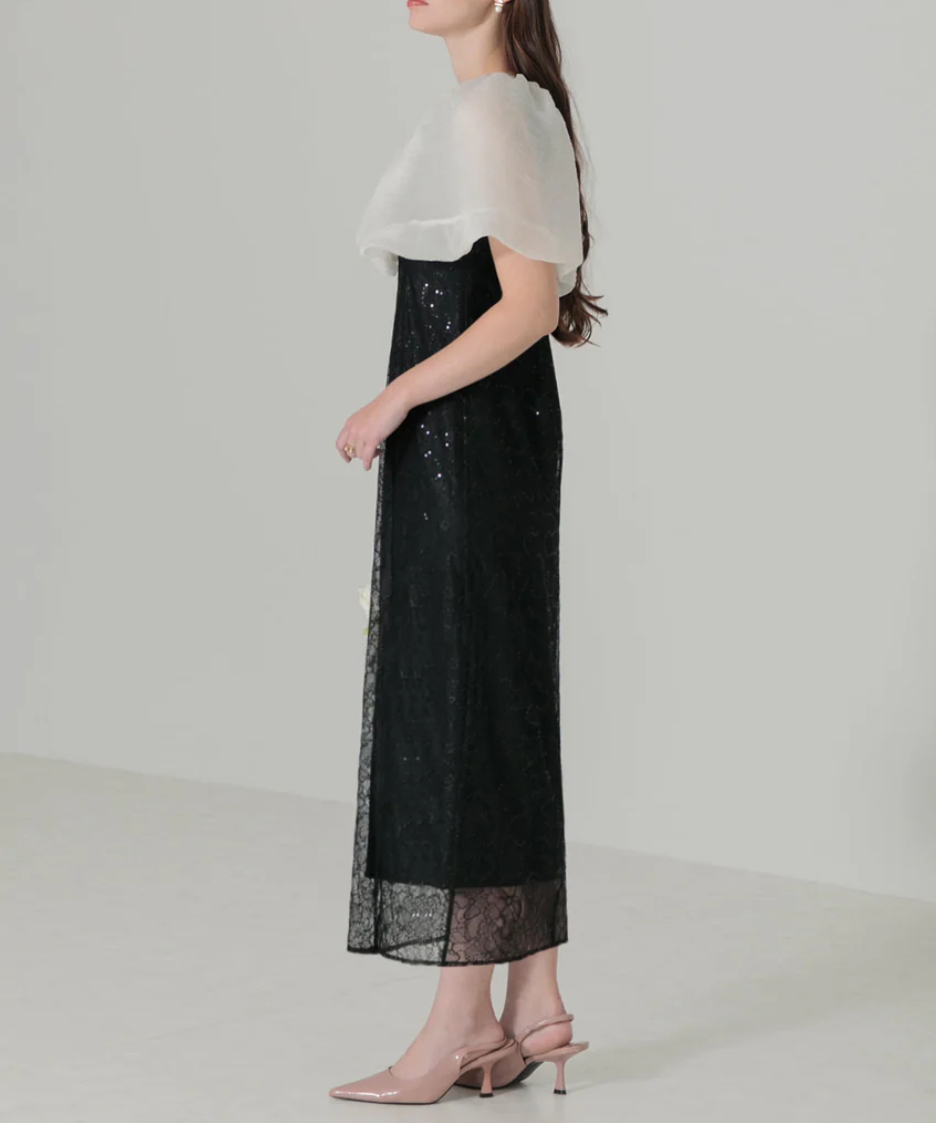 華やかな花柄ワンピースとスパンコール刺繍がデザインの魅力を引き立て、袖部分はオーガンジーレース素材で仕上げ、肩回りを華奢に見せるボリューム感を抑えています。