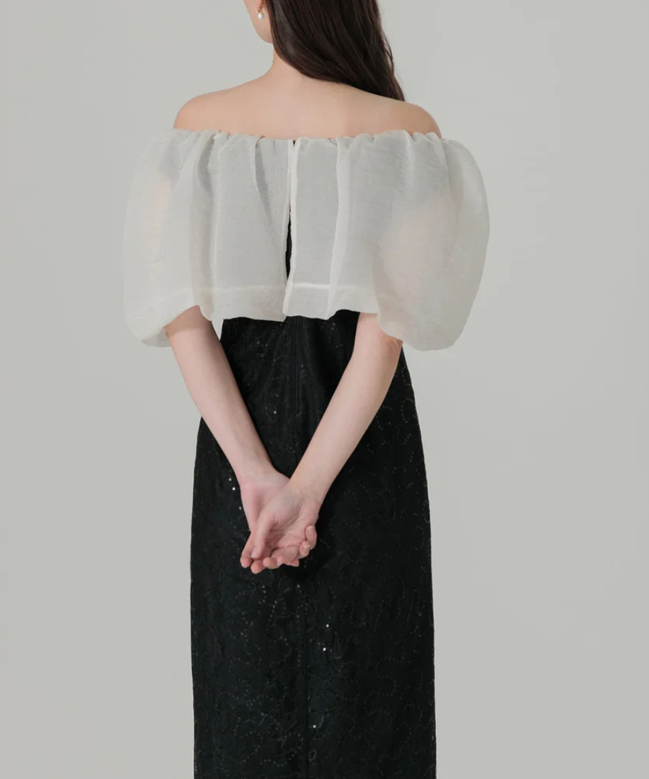 オフショルダーでデコルテを美しく見せ、パフスリーブで二の腕をカバーできる2WAY仕様のアイテムです。