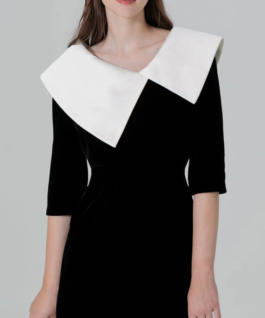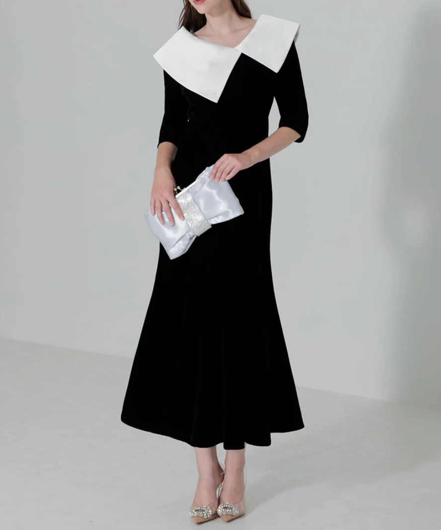 アシンメトリーな襟が目を惹く、高級感と可愛らしさを兼ね備えたドレス。