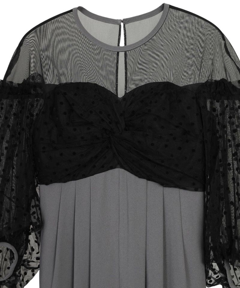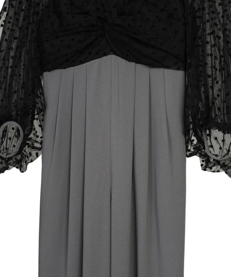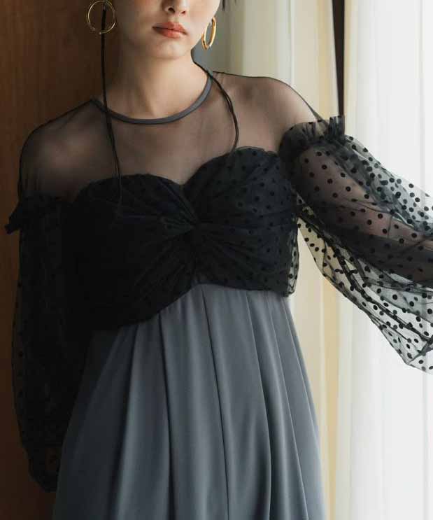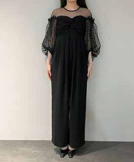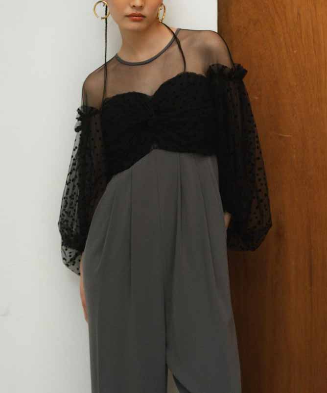 このドレスは、シアーなデコルテとフロッキードットの組み合わせが絶妙で、大人の甘さが程よく表現されています。バスト部分のチュール使いは繊細かつ立体的で、奥行きのあるデザインがとても印象的です。また、ジョーゼット生地のパンツ部分は落ち感が美しく、ワイドなシルエットがクールな印象をプラスしてくれます。袖のふわっとしたブラウジングデザインもポイントで、袖を通した瞬間に特別な気分になれる一着です。後ウエストがゴム仕様になっているので、リラックスした着心地でスタイルアップも叶うのが嬉しいです!