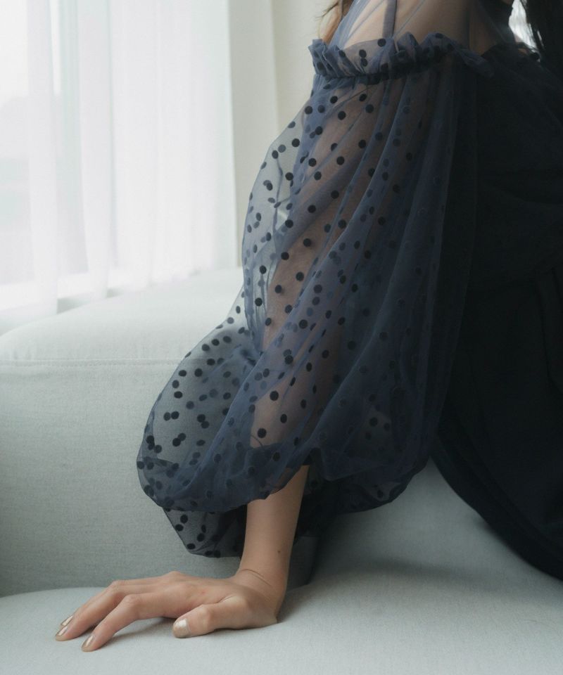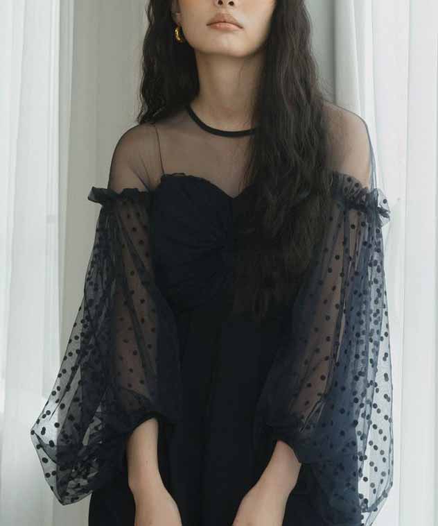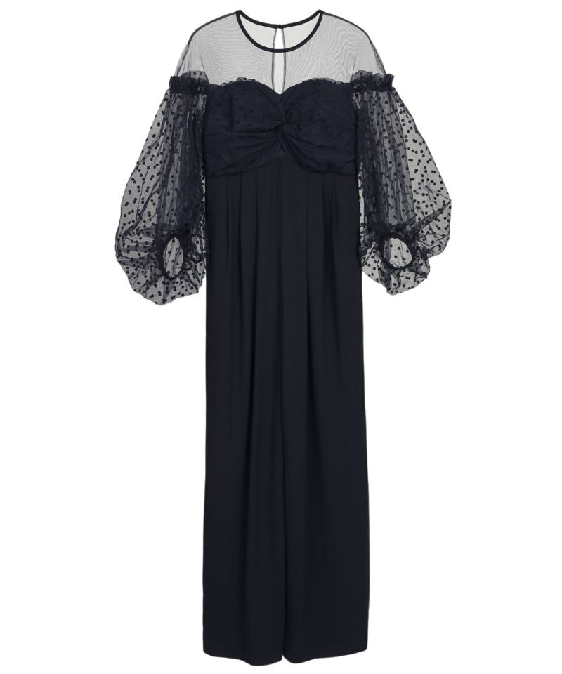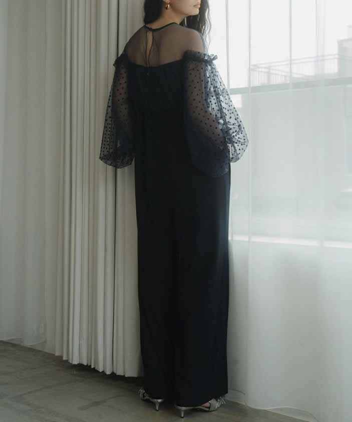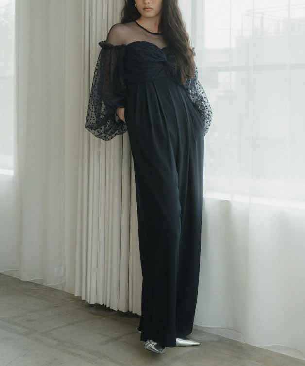 このドレスは、シアーなデコルテとフロッキードットの組み合わせが絶妙で、大人の甘さが程よく表現されています。バスト部分のチュール使いは繊細かつ立体的で、奥行きのあるデザインがとても印象的です。また、ジョーゼット生地のパンツ部分は落ち感が美しく、ワイドなシルエットがクールな印象をプラスしてくれます。袖のふわっとしたブラウジングデザインもポイントで、袖を通した瞬間に特別な気分になれる一着です。後ウエストがゴム仕様になっているので、リラックスした着心地でスタイルアップも叶うのが嬉しいです!