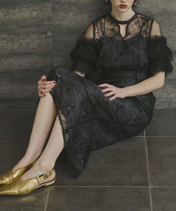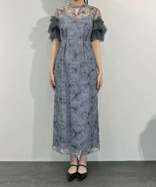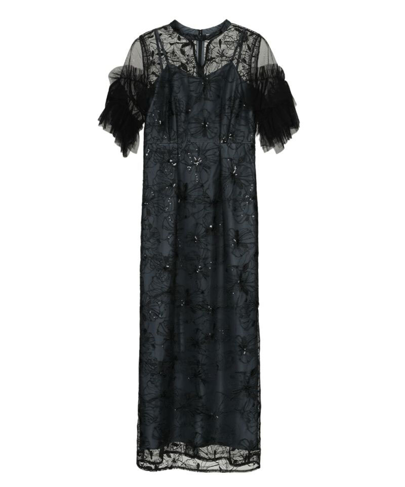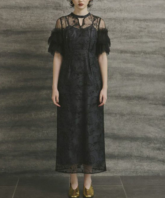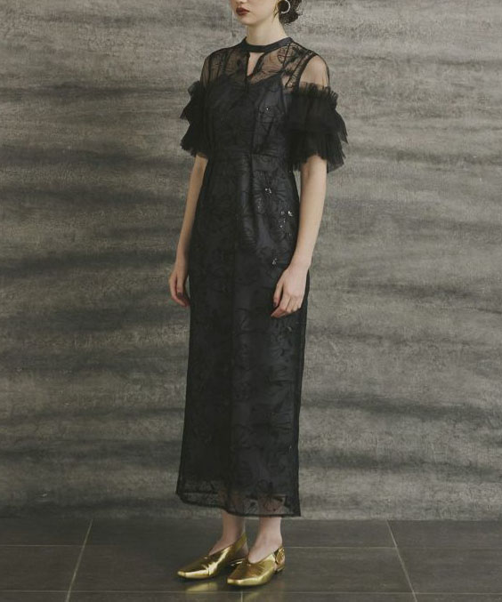 程よいハリと柔らかさのあるナイロンチュールを使用し、螺旋状のチュールフリルがボリュームたっぷりで華やかな印象です。裾に向かって細くなるペンシルラインのシルエットが女性らしさを引き立てるのはもちろん、ちびスタンドカラーがクラシカルな雰囲気を醸し出し、デコルテ部分のキーネック風カットが程よい抜け感を演出しています。さらに、ウエストに施されたタックディテールで体型を問わず着心地良く、スタイルアップ効果も期待できるドレスです。