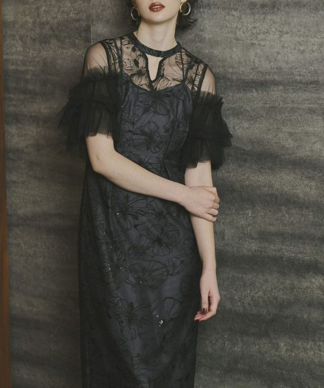 程よいハリと柔らかさのあるナイロンチュールを使用し、螺旋状のチュールフリルがボリュームたっぷりで華やかな印象です。裾に向かって細くなるペンシルラインのシルエットが女性らしさを引き立てるのはもちろん、ちびスタンドカラーがクラシカルな雰囲気を醸し出し、デコルテ部分のキーネック風カットが程よい抜け感を演出しています。さらに、ウエストに施されたタックディテールで体型を問わず着心地良く、スタイルアップ効果も期待できるドレスです。