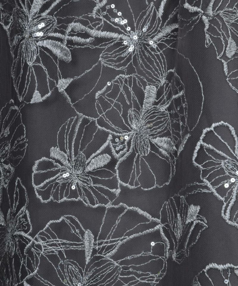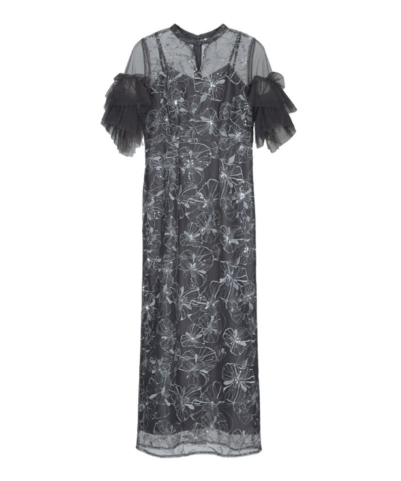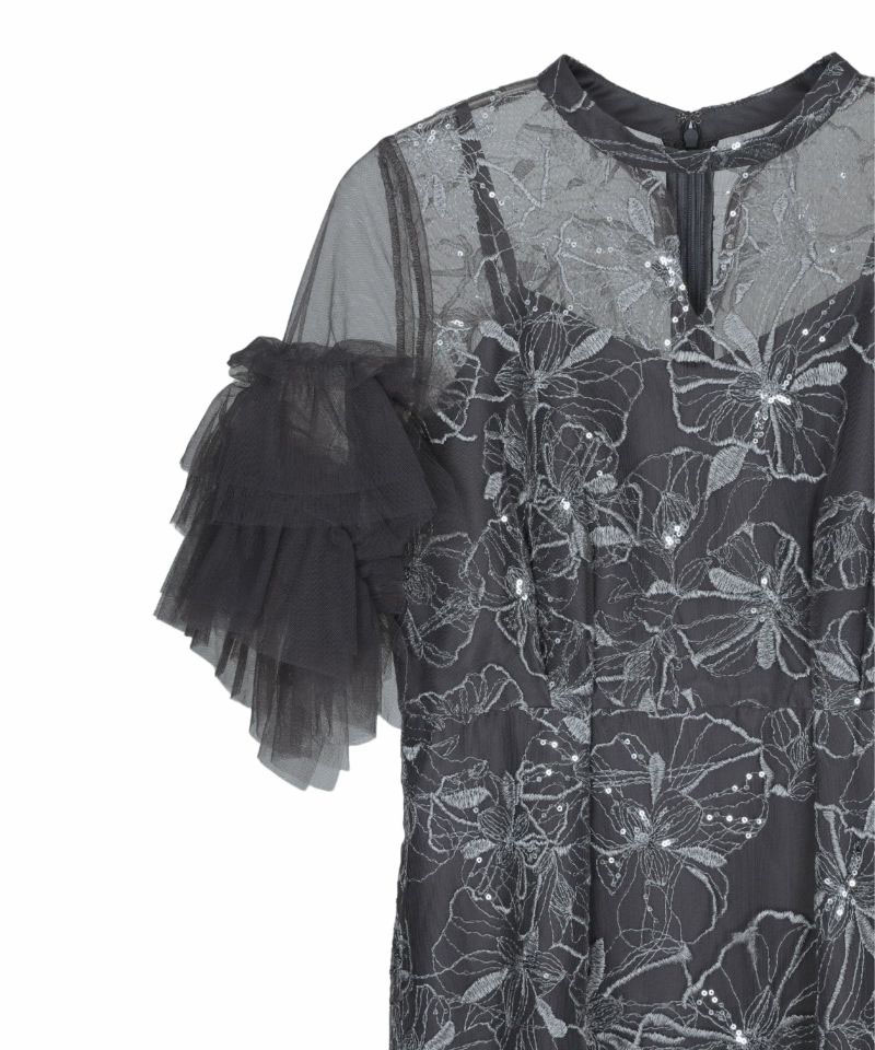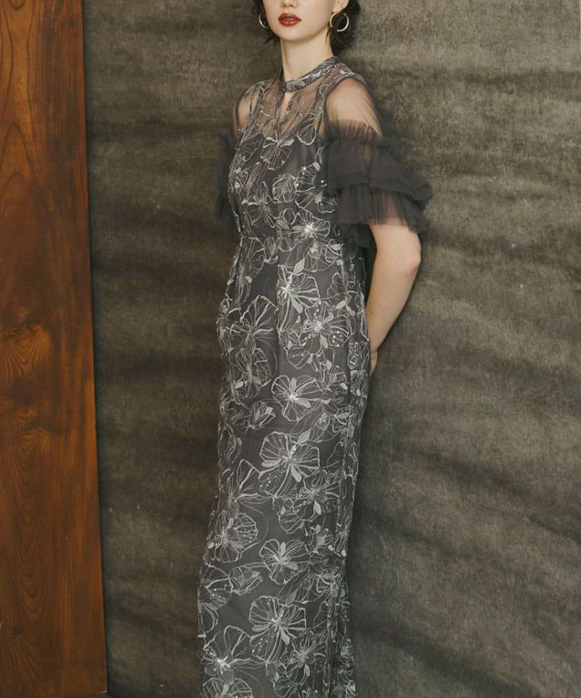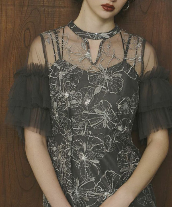 程よいハリと柔らかさのあるナイロンチュールを使用し、螺旋状のチュールフリルがボリュームたっぷりで華やかな印象です。裾に向かって細くなるペンシルラインのシルエットが女性らしさを引き立てるのはもちろん、ちびスタンドカラーがクラシカルな雰囲気を醸し出し、デコルテ部分のキーネック風カットが程よい抜け感を演出しています。さらに、ウエストに施されたタックディテールで体型を問わず着心地良く、スタイルアップ効果も期待できるドレスです。