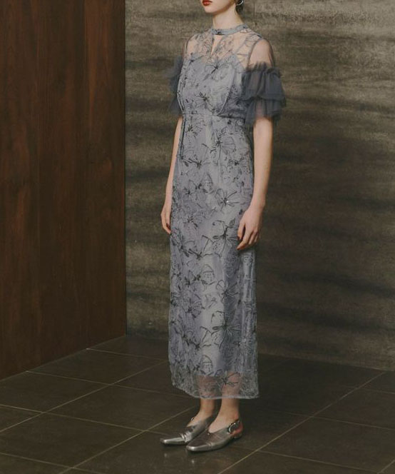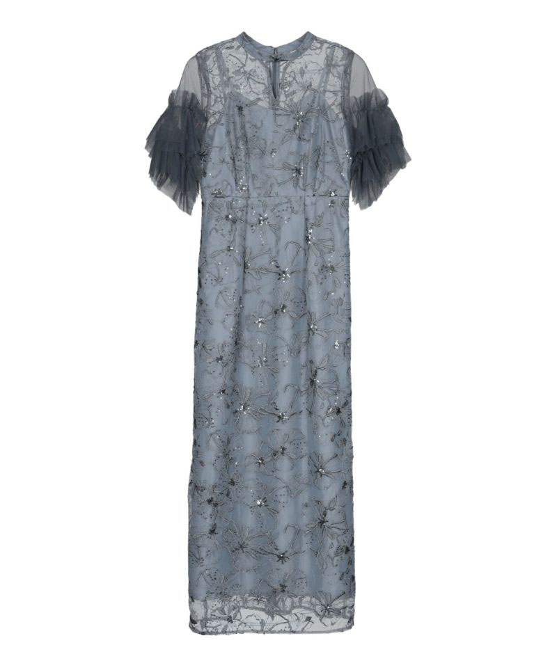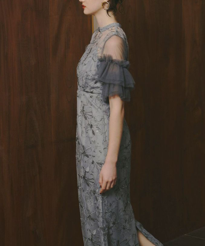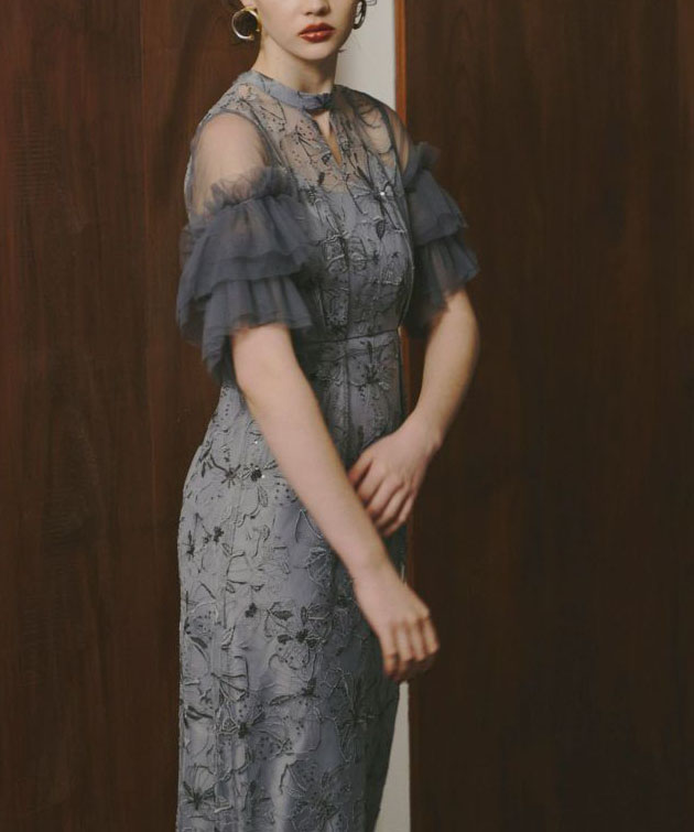 程よいハリと柔らかさのあるナイロンチュールを使用し、螺旋状のチュールフリルがボリュームたっぷりで華やかな印象です。裾に向かって細くなるペンシルラインのシルエットが女性らしさを引き立てるのはもちろん、ちびスタンドカラーがクラシカルな雰囲気を醸し出し、デコルテ部分のキーネック風カットが程よい抜け感を演出しています。さらに、ウエストに施されたタックディテールで体型を問わず着心地良く、スタイルアップ効果も期待できるドレスです。