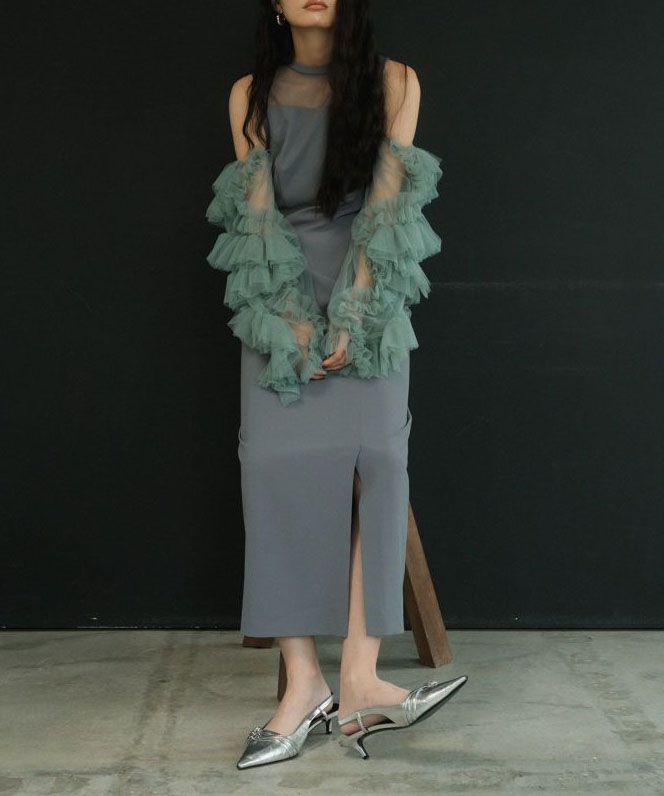 大胆なボリューム感が目を惹くチュールドレスは、柔らかな着心地と華やかさを両立した一枚です。シンプルなデザインのワンピースに対して、ボリュームスリーブのチュールが絶妙なバランスを演出。さらに、ドッキング仕様やアームカバーとしてのアレンジが可能で、デザイン性と実用性を兼ね備えています。