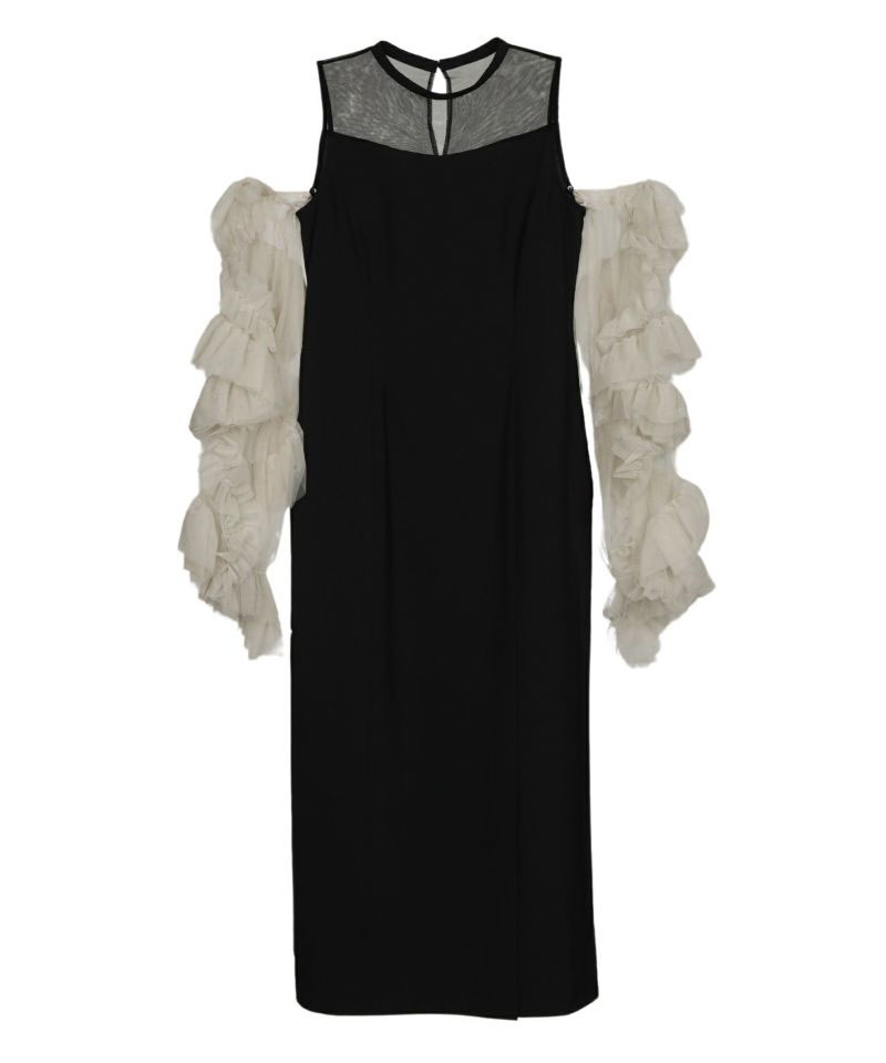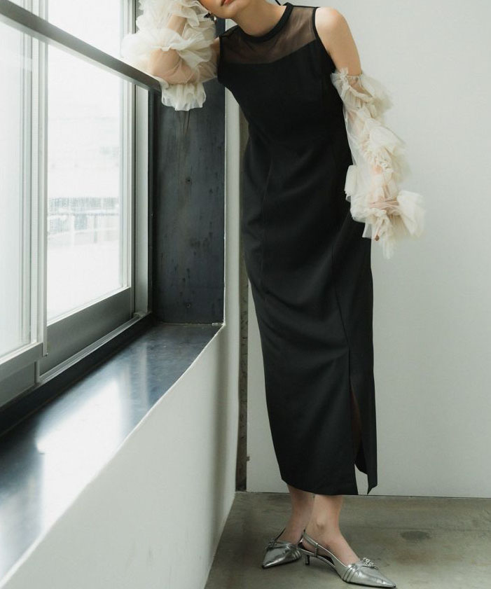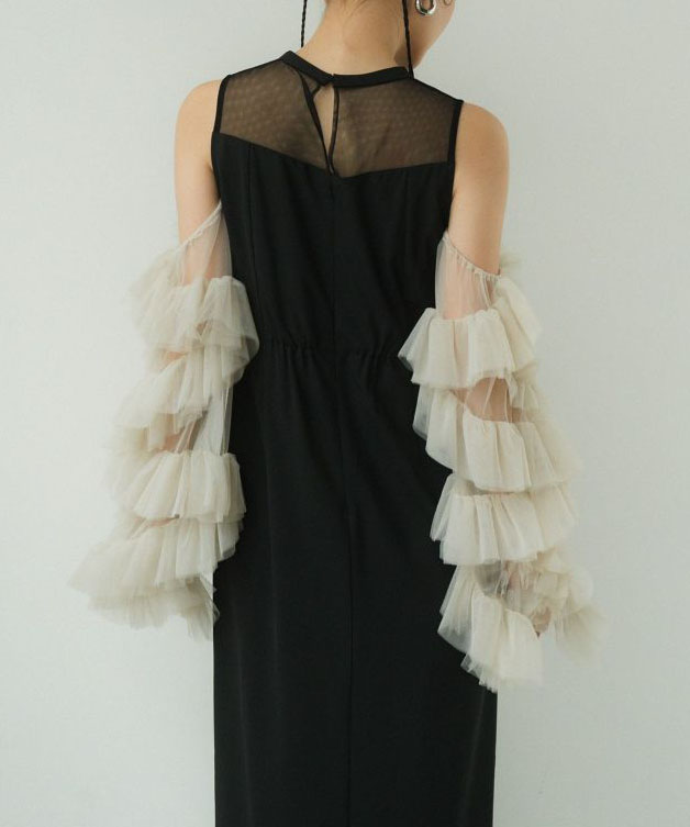 大胆なボリューム感が目を惹くチュールドレスは、柔らかな着心地と華やかさを両立した一枚です。シンプルなデザインのワンピースに対して、ボリュームスリーブのチュールが絶妙なバランスを演出。さらに、ドッキング仕様やアームカバーとしてのアレンジが可能で、デザイン性と実用性を兼ね備えています。