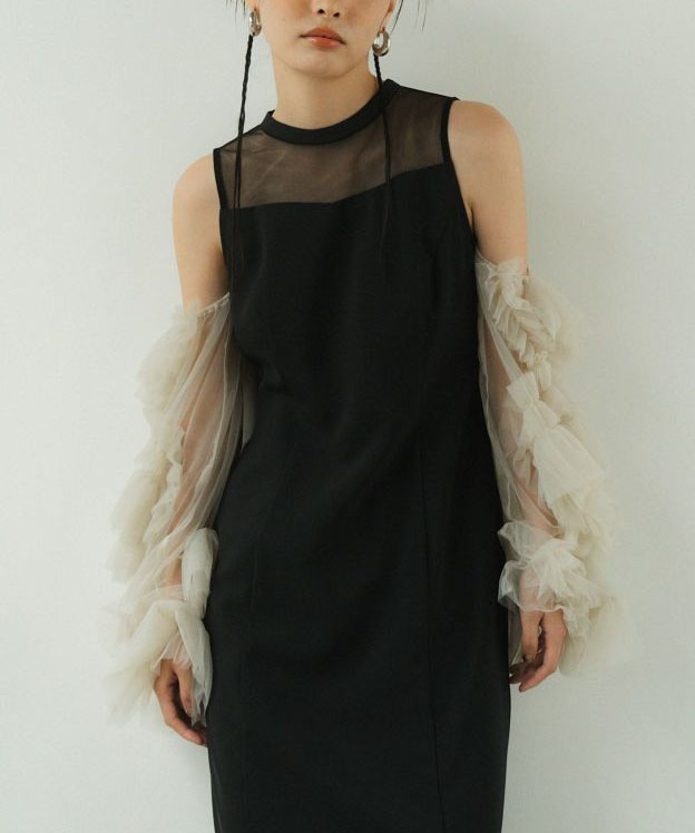 大胆なボリューム感が目を惹くチュールドレスは、柔らかな着心地と華やかさを両立した一枚です。シンプルなデザインのワンピースに対して、ボリュームスリーブのチュールが絶妙なバランスを演出。さらに、ドッキング仕様やアームカバーとしてのアレンジが可能で、デザイン性と実用性を兼ね備えています。