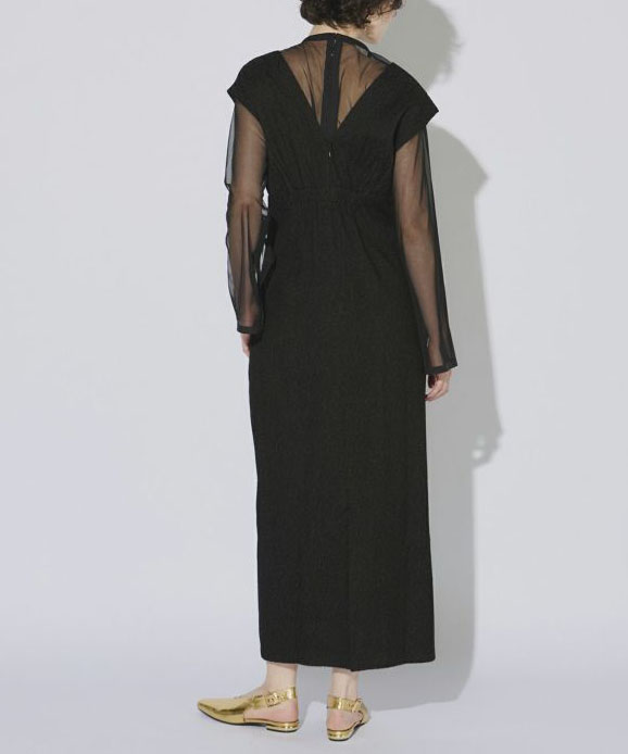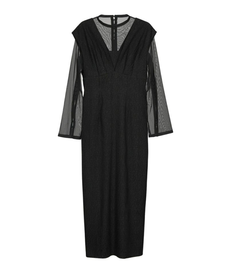 高級感あふれるジャガード素材のワンピースと、くるみボタンが施されたチュールインナーのセットは、それぞれ単品でも使える汎用性の高いアイテムです。ワンピースは深めのVネックと切替デザインでシャープかつスタイルアップを叶え、取り外し可能な胸当てで様々なシーンに対応可能。チュールインナーはスリットスリーブとしても活用でき、シーンに応じた多彩な着こなしが楽しめる魅力的なセットアップです。