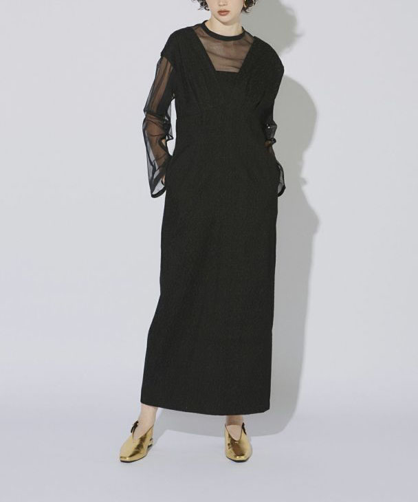 高級感あふれるジャガード素材のワンピースと、くるみボタンが施されたチュールインナーのセットは、それぞれ単品でも使える汎用性の高いアイテムです。ワンピースは深めのVネックと切替デザインでシャープかつスタイルアップを叶え、取り外し可能な胸当てで様々なシーンに対応可能。チュールインナーはスリットスリーブとしても活用でき、シーンに応じた多彩な着こなしが楽しめる魅力的なセットアップです。