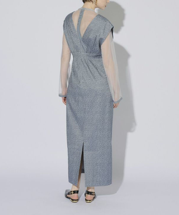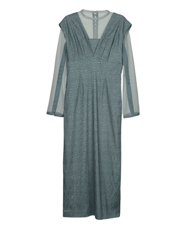 高級感あふれるジャガード素材のワンピースと、くるみボタンが施されたチュールインナーのセットは、それぞれ単品でも使える汎用性の高いアイテムです。ワンピースは深めのVネックと切替デザインでシャープかつスタイルアップを叶え、取り外し可能な胸当てで様々なシーンに対応可能。チュールインナーはスリットスリーブとしても活用でき、シーンに応じた多彩な着こなしが楽しめる魅力的なセットアップです。