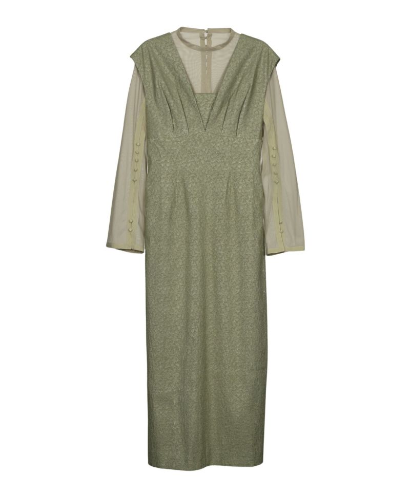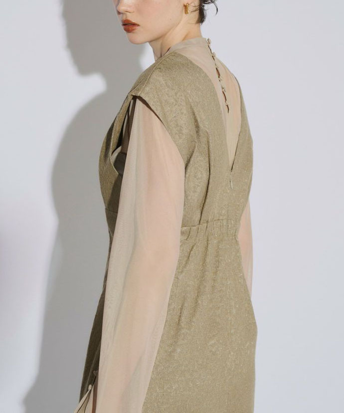 高級感あふれるジャガード素材のワンピースと、くるみボタンが施されたチュールインナーのセットは、それぞれ単品でも使える汎用性の高いアイテムです。ワンピースは深めのVネックと切替デザインでシャープかつスタイルアップを叶え、取り外し可能な胸当てで様々なシーンに対応可能。チュールインナーはスリットスリーブとしても活用でき、シーンに応じた多彩な着こなしが楽しめる魅力的なセットアップです。