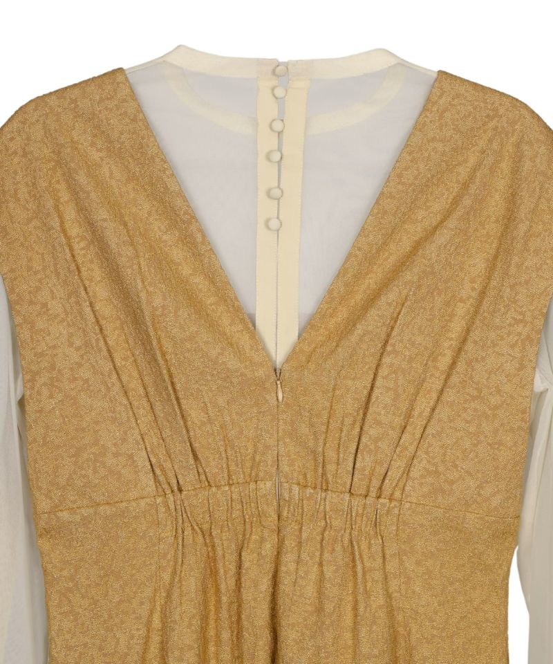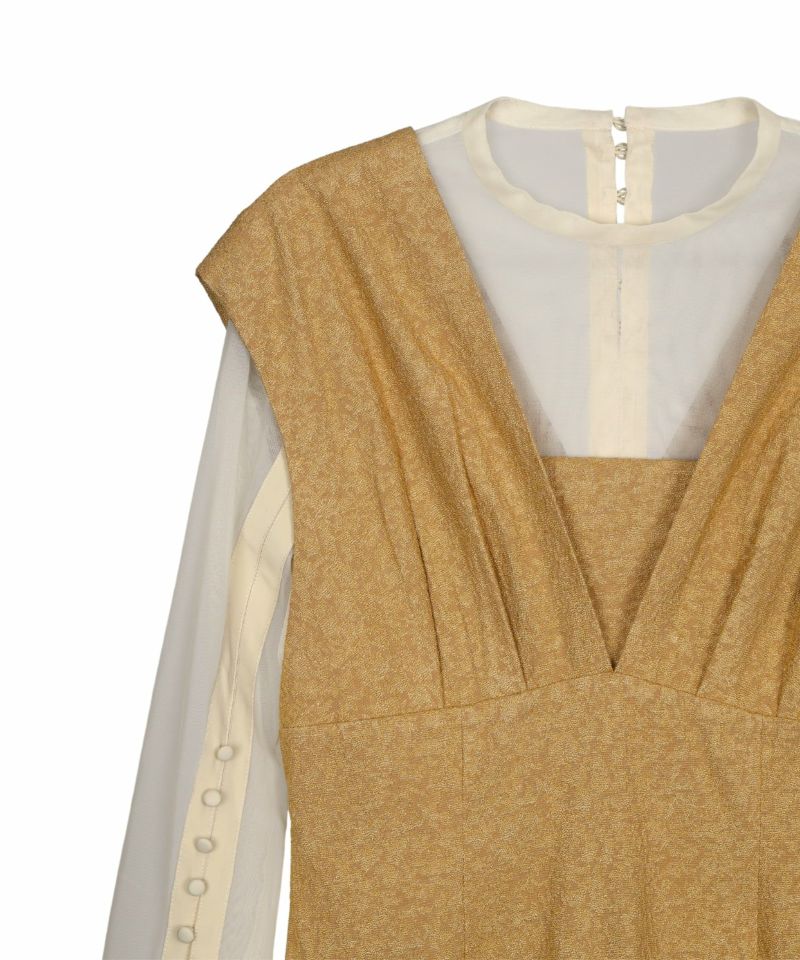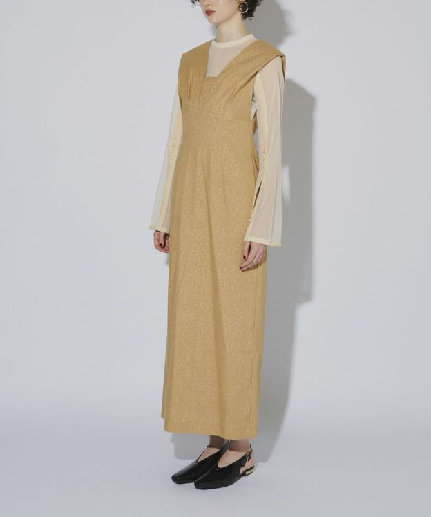 高級感あふれるジャガード素材のワンピースと、くるみボタンが施されたチュールインナーのセットは、それぞれ単品でも使える汎用性の高いアイテムです。ワンピースは深めのVネックと切替デザインでシャープかつスタイルアップを叶え、取り外し可能な胸当てで様々なシーンに対応可能。チュールインナーはスリットスリーブとしても活用でき、シーンに応じた多彩な着こなしが楽しめる魅力的なセットアップです。