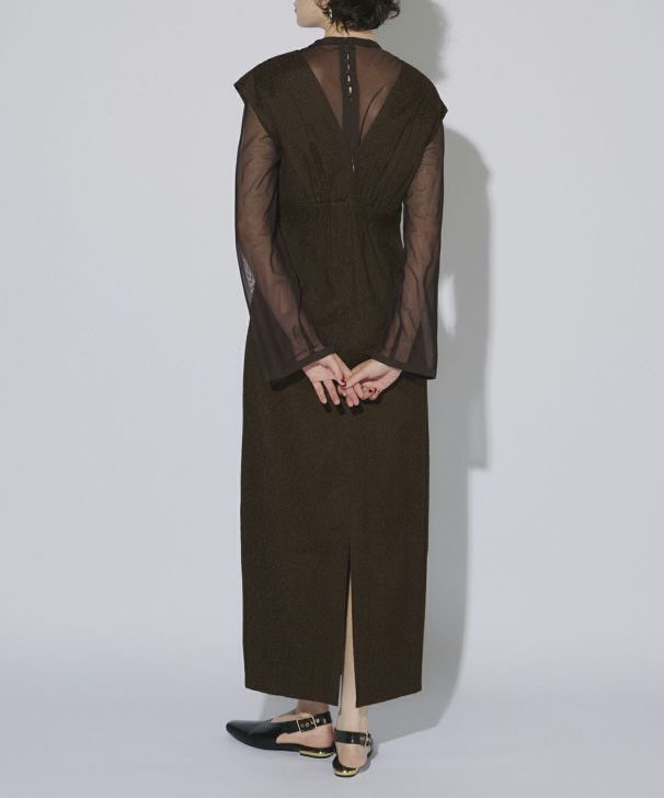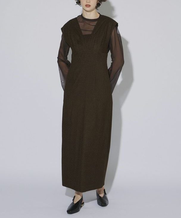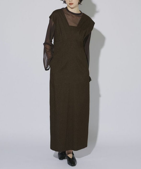 高級感あふれるジャガード素材のワンピースと、くるみボタンが施されたチュールインナーのセットは、それぞれ単品でも使える汎用性の高いアイテムです。ワンピースは深めのVネックと切替デザインでシャープかつスタイルアップを叶え、取り外し可能な胸当てで様々なシーンに対応可能。チュールインナーはスリットスリーブとしても活用でき、シーンに応じた多彩な着こなしが楽しめる魅力的なセットアップです。