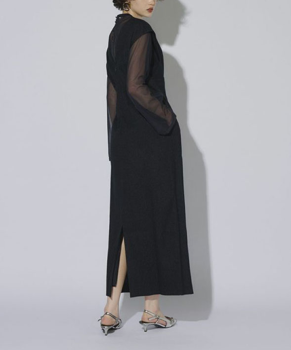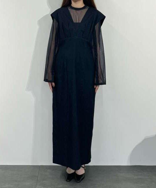 高級感あふれるジャガード素材のワンピースと、くるみボタンが施されたチュールインナーのセットは、それぞれ単品でも使える汎用性の高いアイテムです。ワンピースは深めのVネックと切替デザインでシャープかつスタイルアップを叶え、取り外し可能な胸当てで様々なシーンに対応可能。チュールインナーはスリットスリーブとしても活用でき、シーンに応じた多彩な着こなしが楽しめる魅力的なセットアップです。