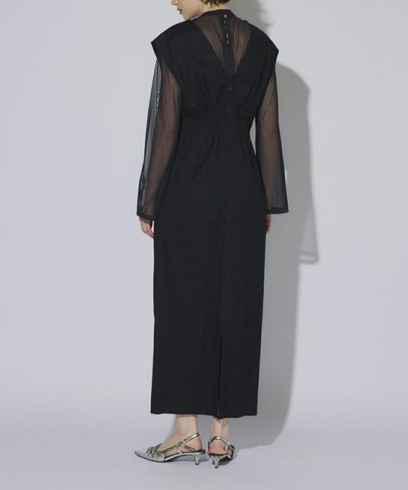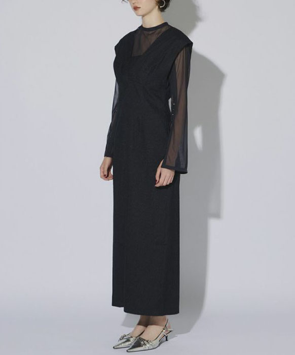 高級感あふれるジャガード素材のワンピースと、くるみボタンが施されたチュールインナーのセットは、それぞれ単品でも使える汎用性の高いアイテムです。ワンピースは深めのVネックと切替デザインでシャープかつスタイルアップを叶え、取り外し可能な胸当てで様々なシーンに対応可能。チュールインナーはスリットスリーブとしても活用でき、シーンに応じた多彩な着こなしが楽しめる魅力的なセットアップです。
