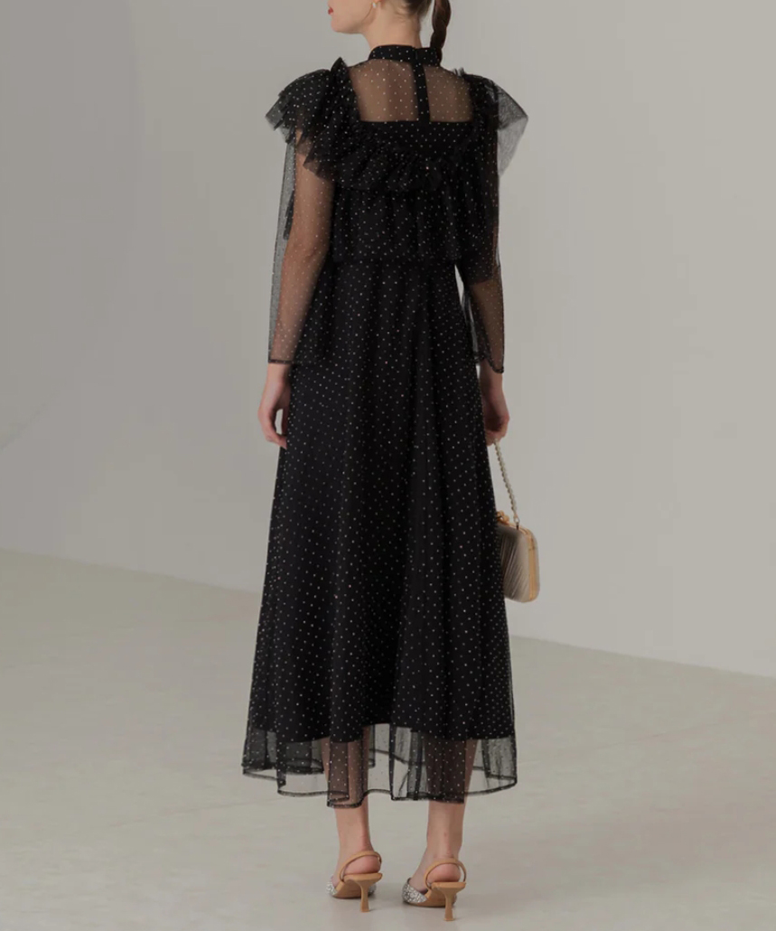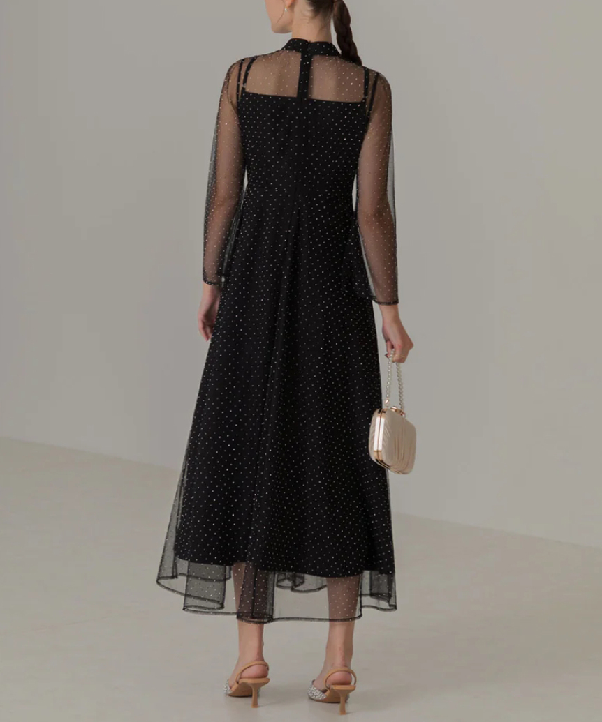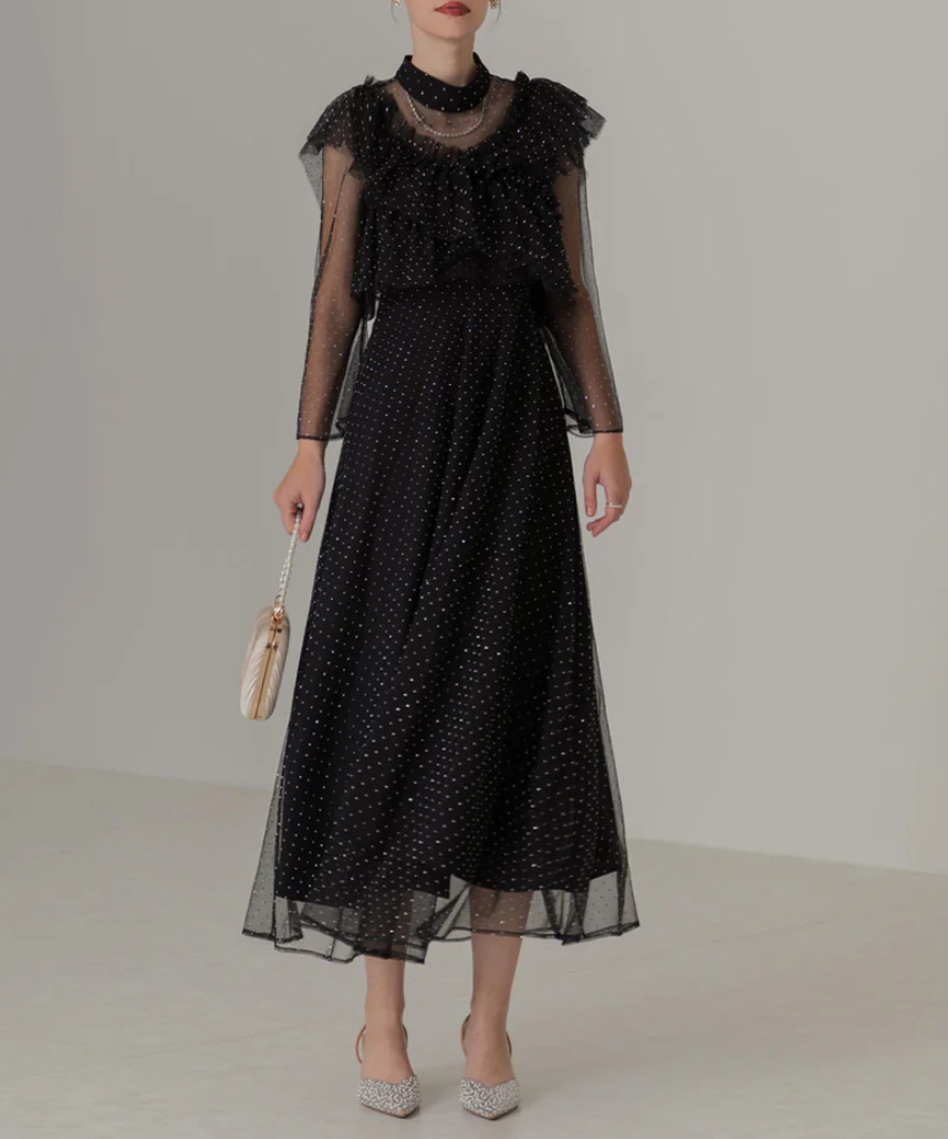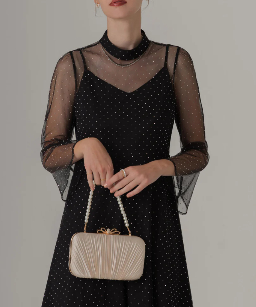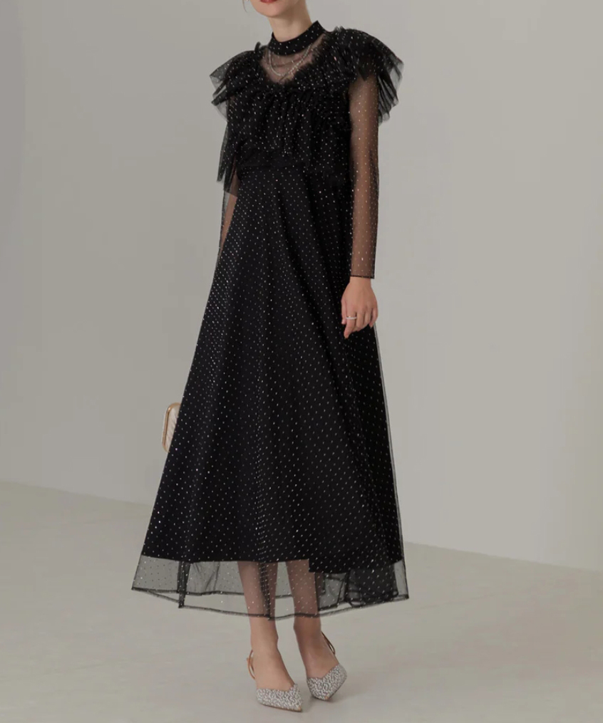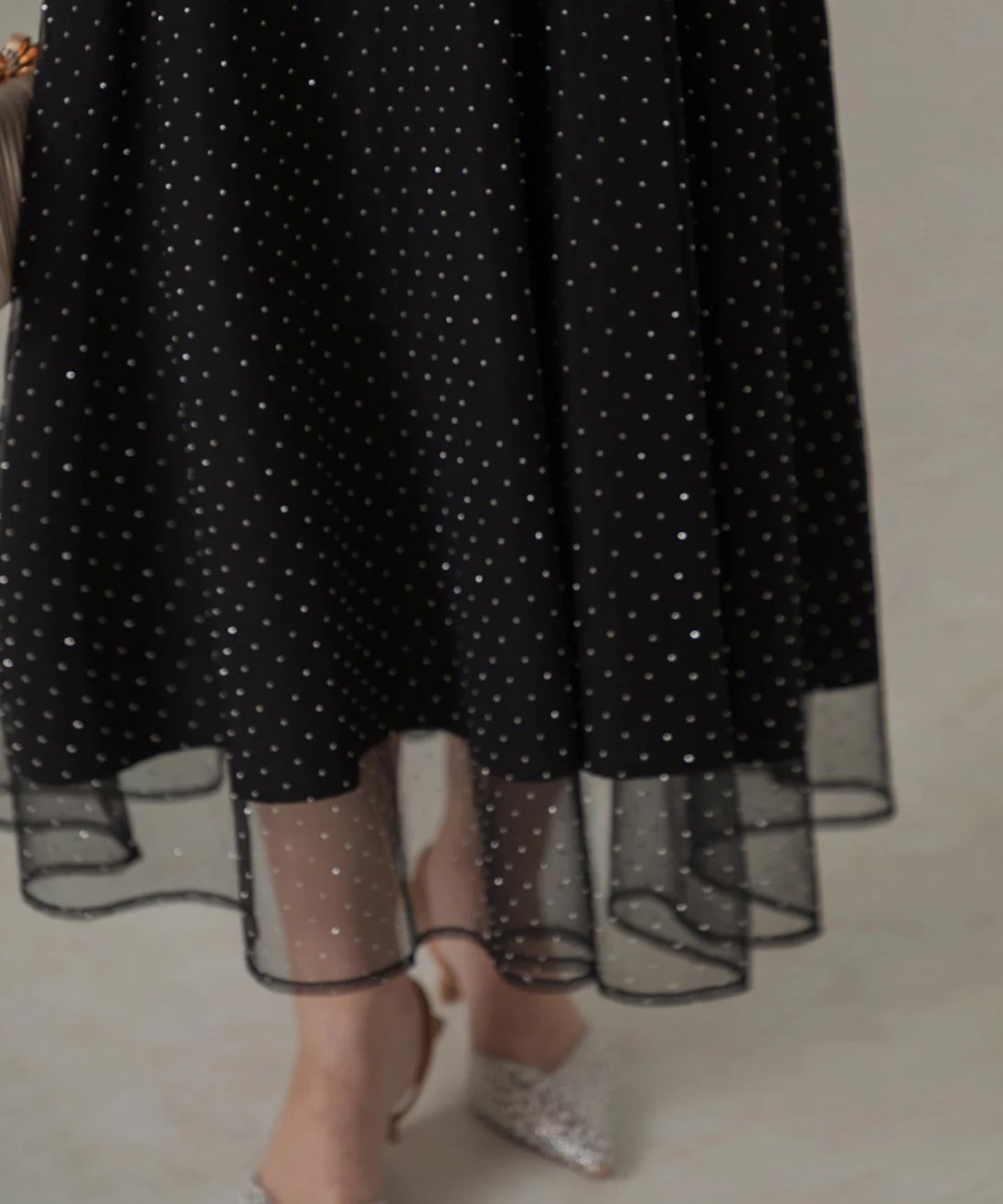 ストーンをたっぷり使用したドット柄が昼夜を問わず輝き存在感を引き立て、チュールにギャザーの立体感あるデザインで胸元を華やかに彩ります。