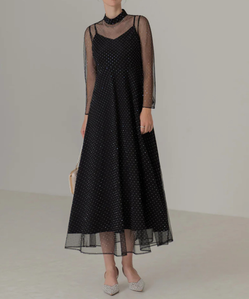 程よい透け感を持つ素材で抜け感と儚げな印象を与え、胸元のチュールギャザーは着脱可能でシンプルなワンピースとしても着用できます。