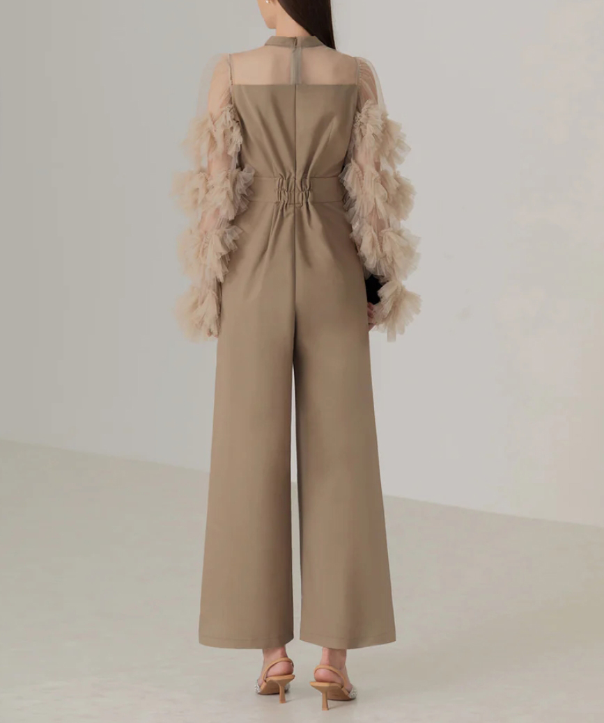 シックなカラーリングとトレンド感あるスリーブデザインが目を引くパンツドレス。