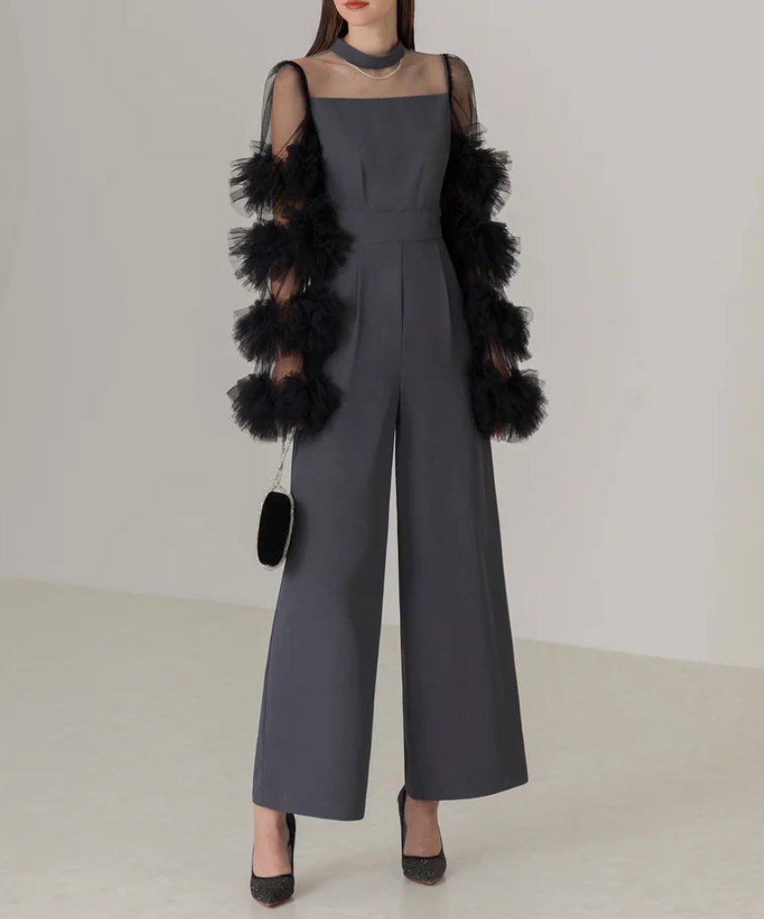 シックなカラーリングとトレンド感あるスリーブデザインが目を引くパンツドレス。
