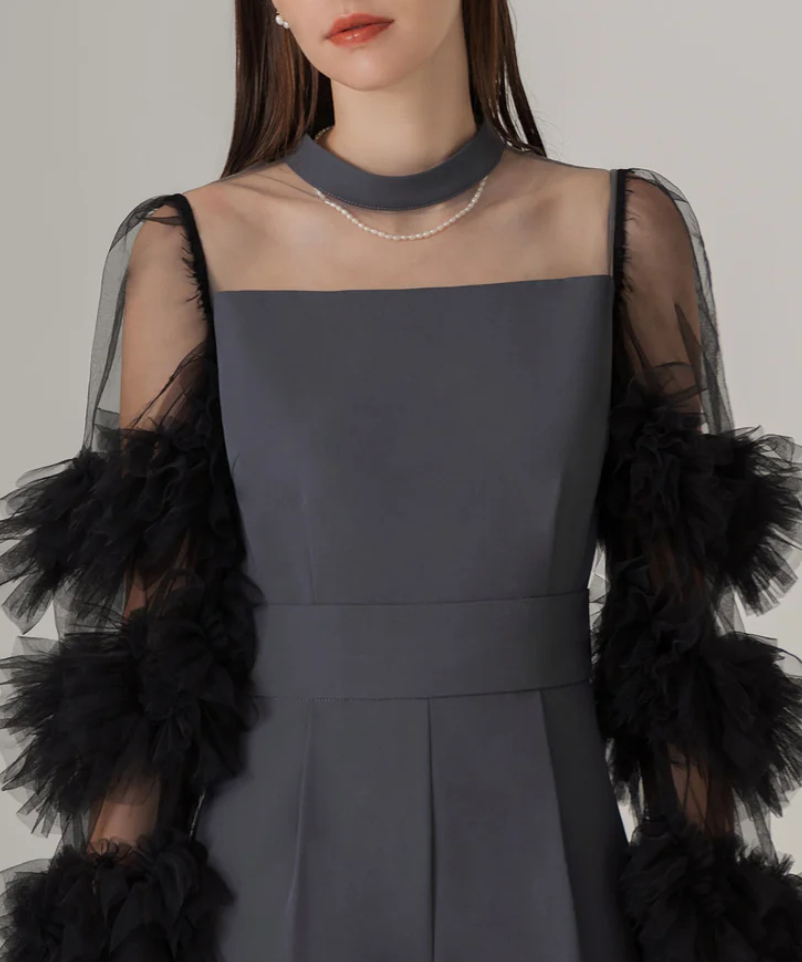 繊細なチュール素材を使ったスリーブは軽やかで女性らしい印象を与え、大ぶりなフリルが動きに合わせて華やかさを加えます。