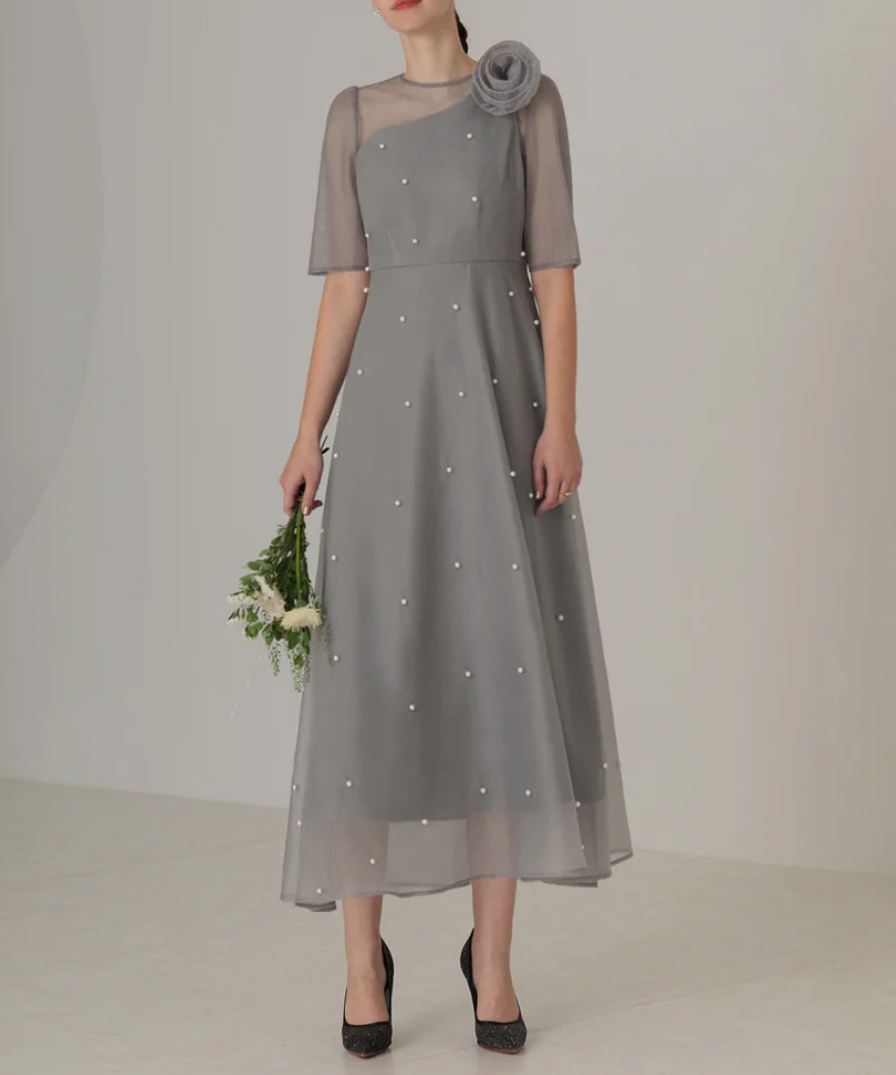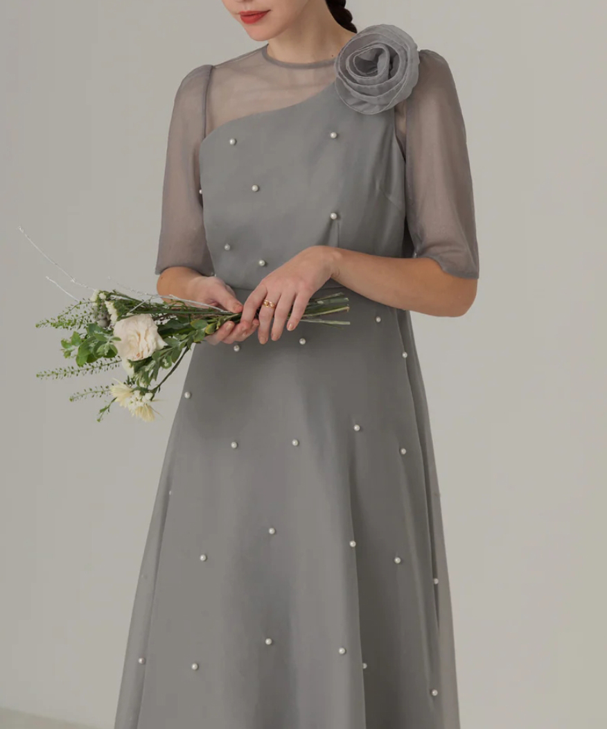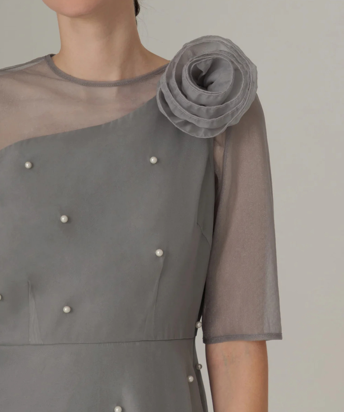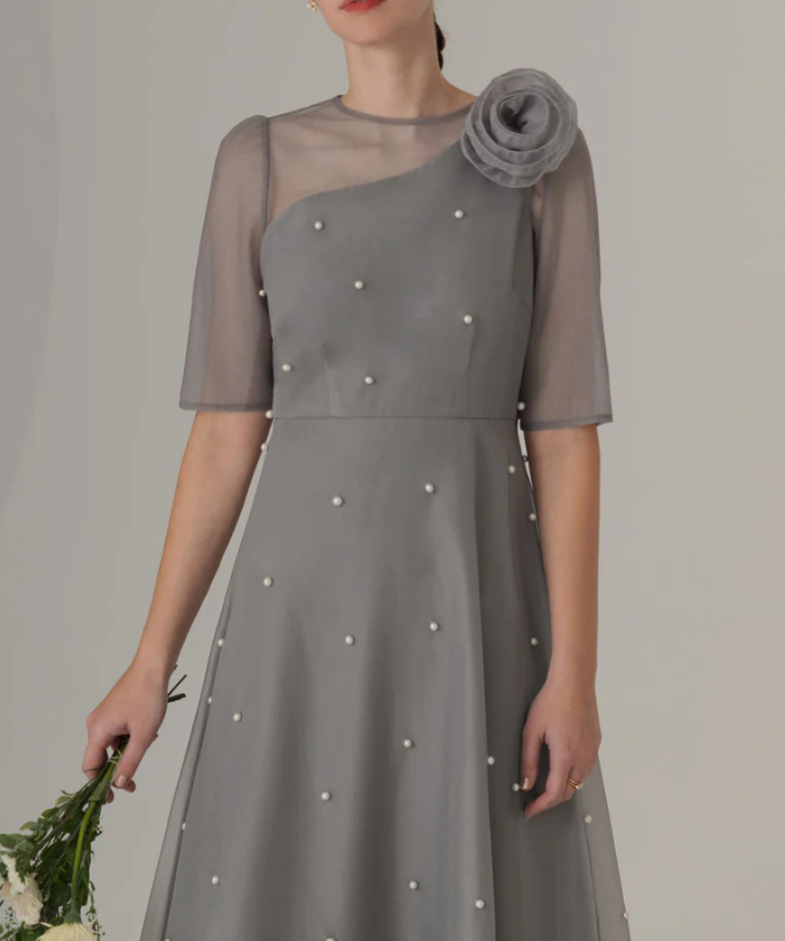 コサージュは取り外し可能となっており、ワンショルダー風のデザインが強調されモダンでスタイリッシュなスタイルに。