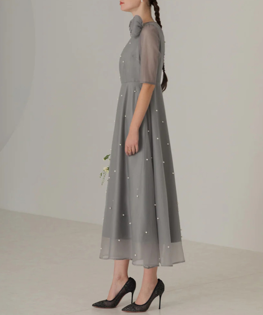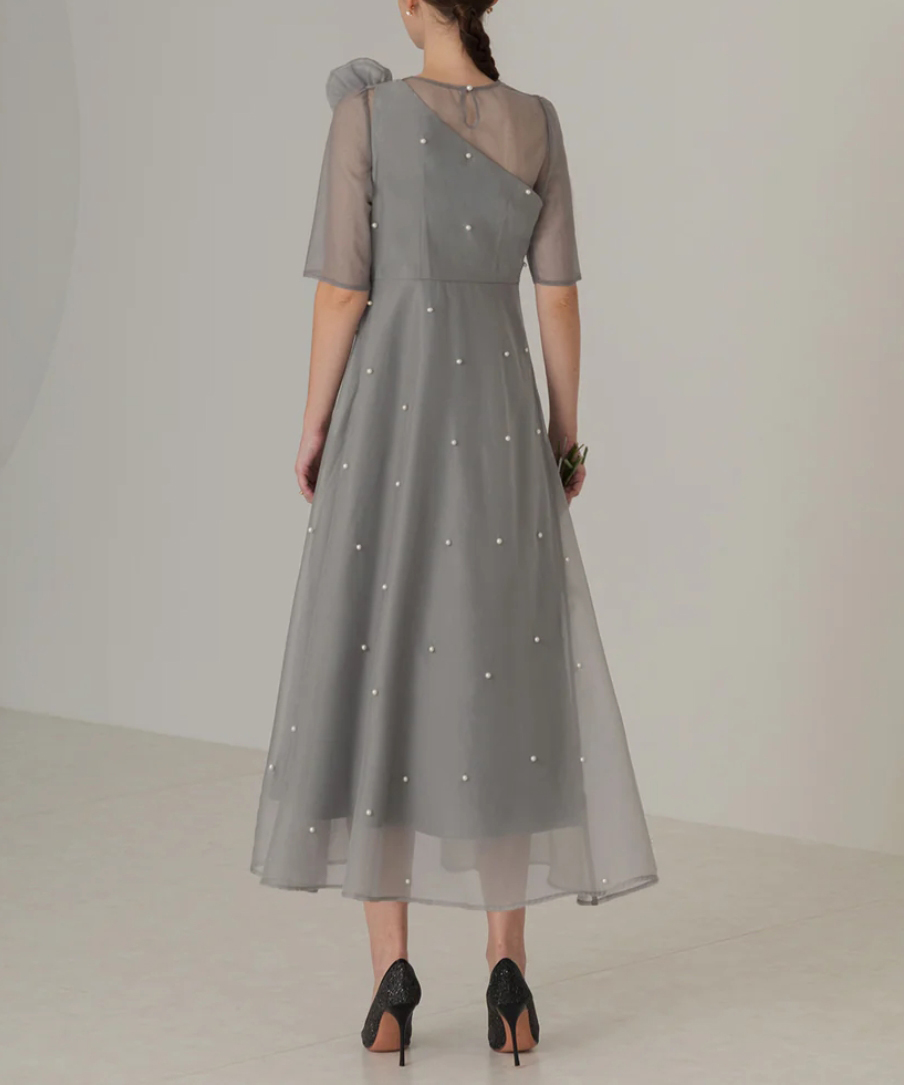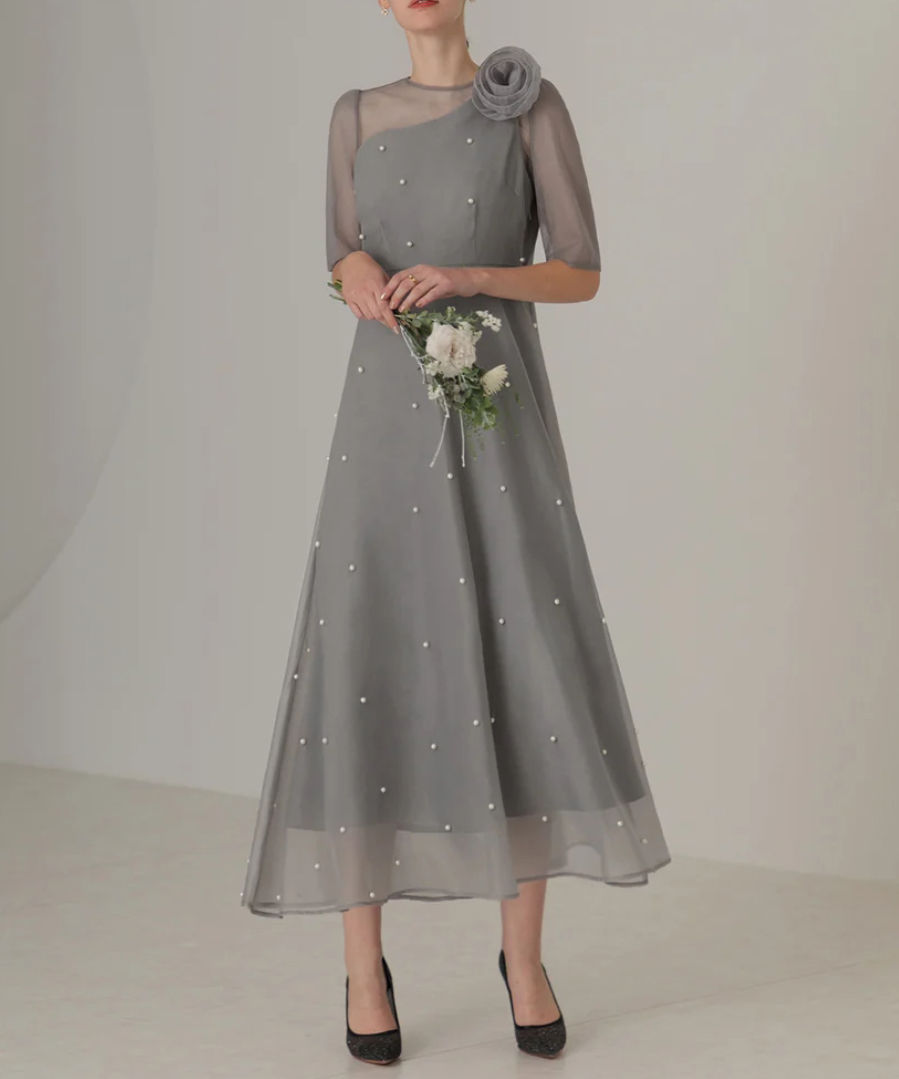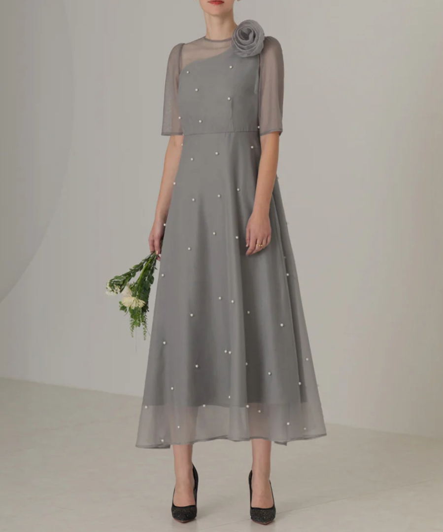 コサージュは取り外し可能となっており、ワンショルダー風のデザインが強調されモダンでスタイリッシュなスタイルに。