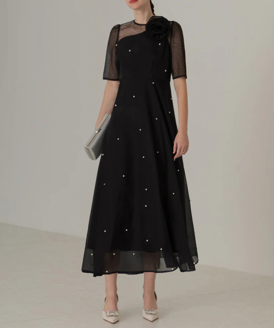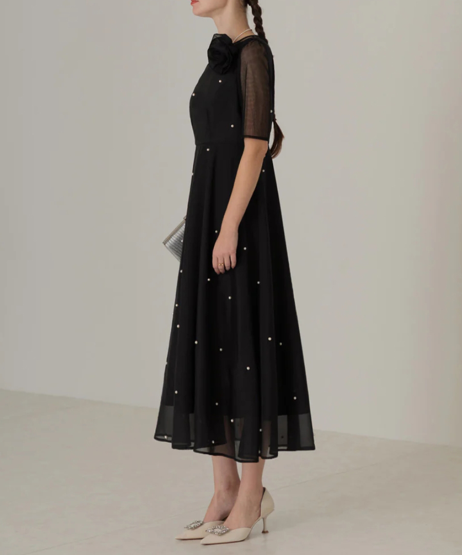 コサージュは取り外し可能となっており、ワンショルダー風のデザインが強調されモダンでスタイリッシュなスタイルに。