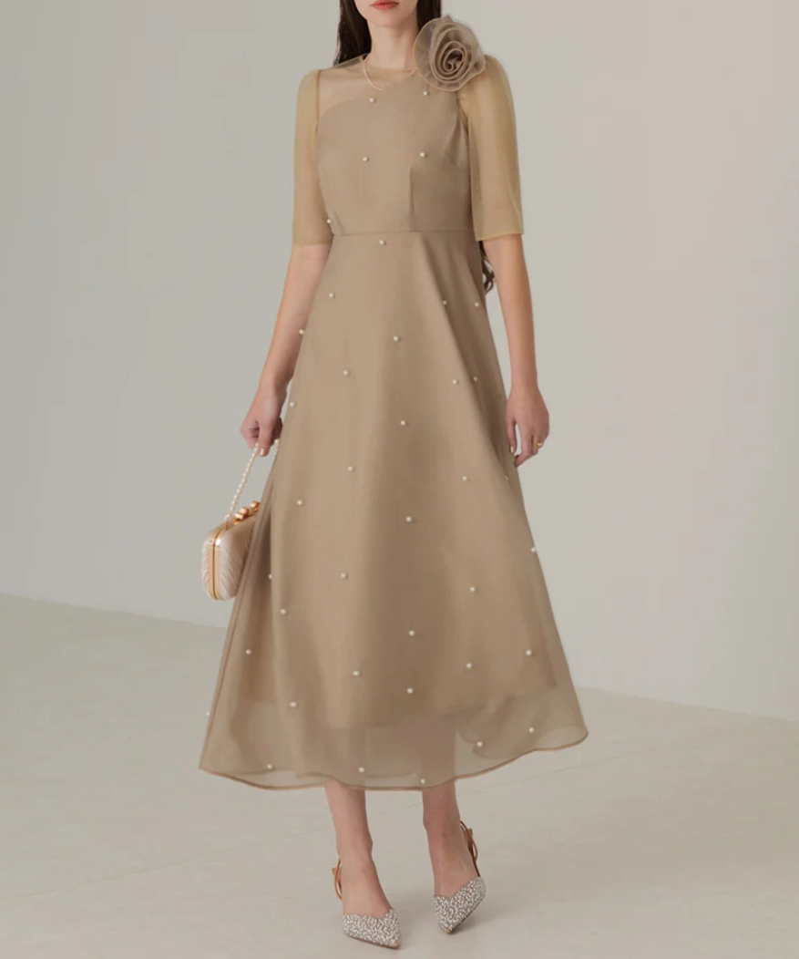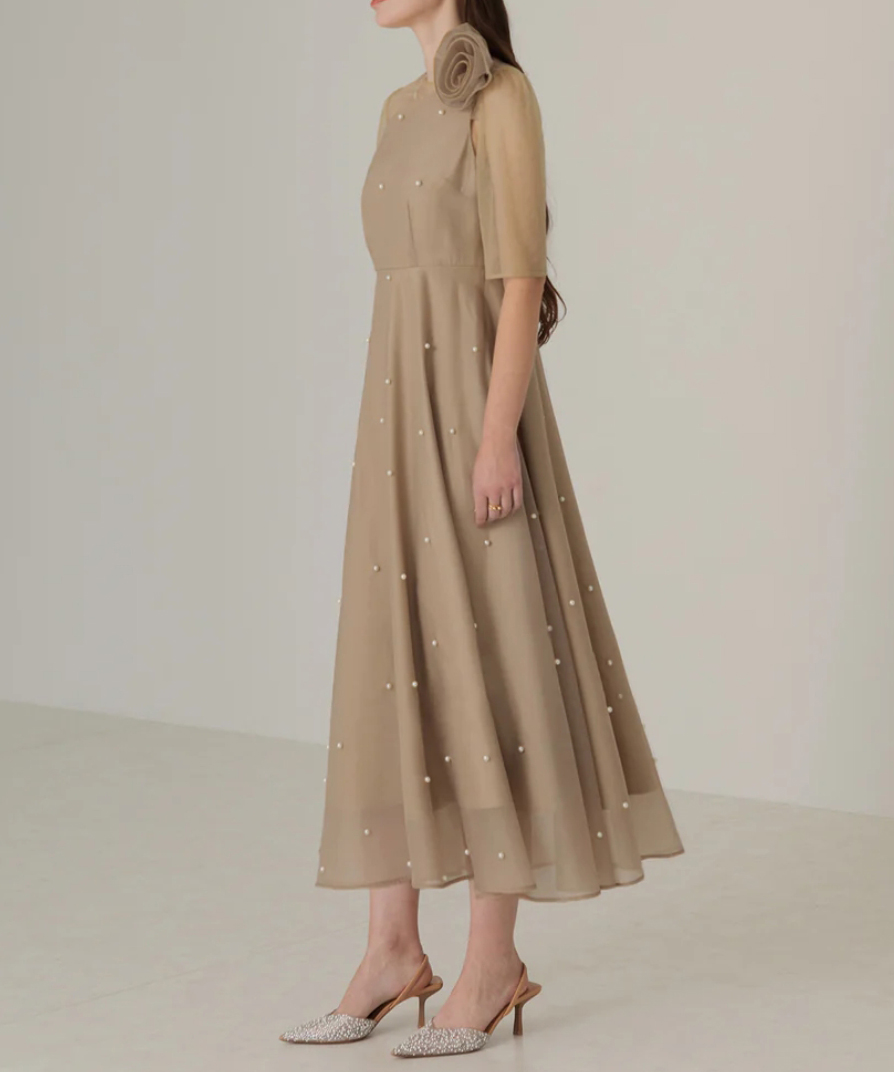 ふんだんに散りばめたパールとローズのモチーフが洗練された雰囲気を演出するAラインドレス。