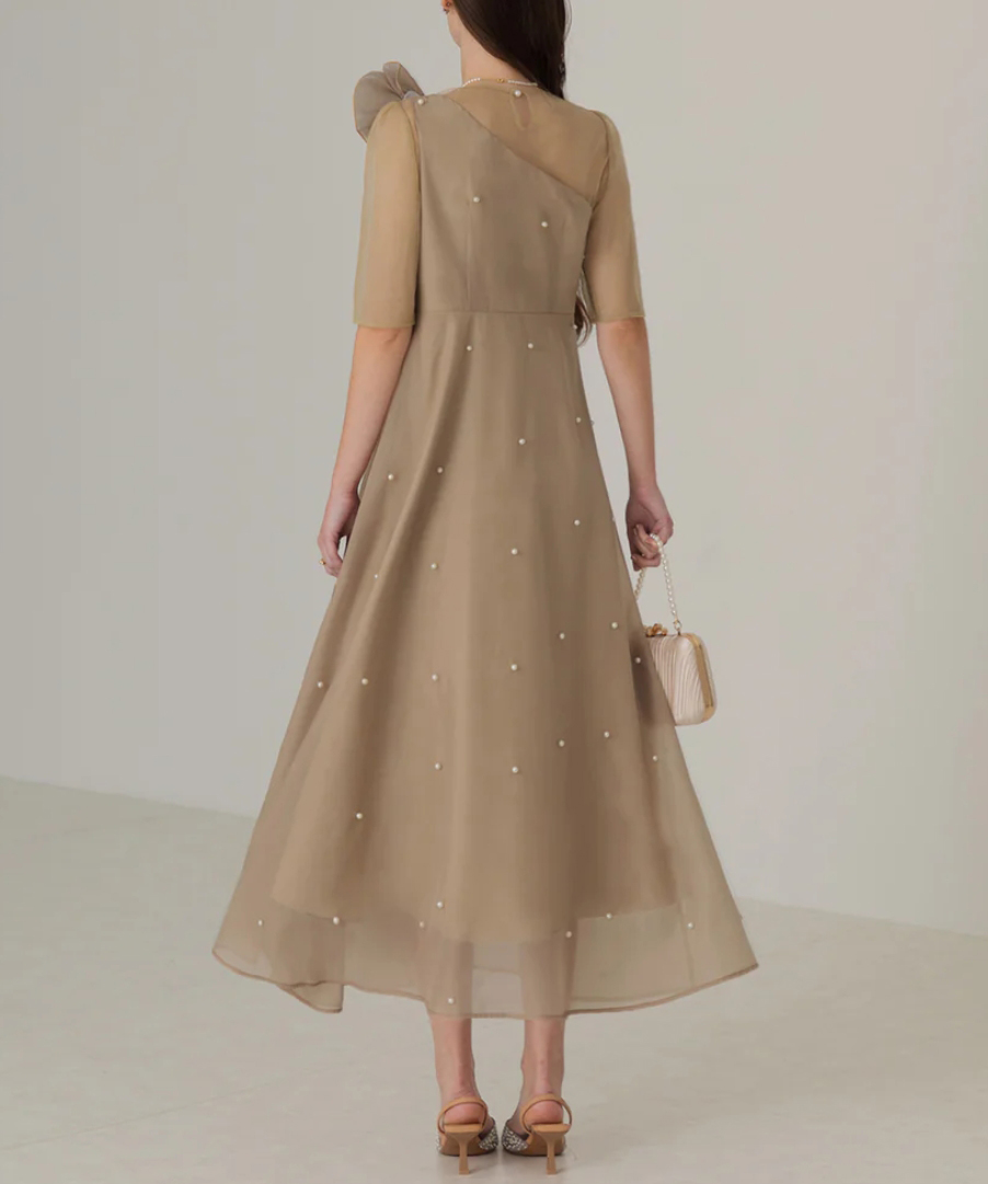 コサージュは取り外し可能となっており、ワンショルダー風のデザインが強調されモダンでスタイリッシュなスタイルに。