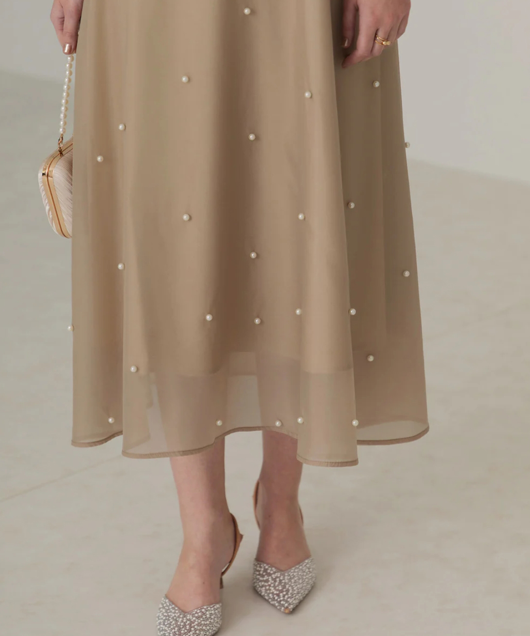 全体的に散りばめられた小粒のパールが高級感と繊細な輝きをプラスしシンプルなカラーを引き立てます。