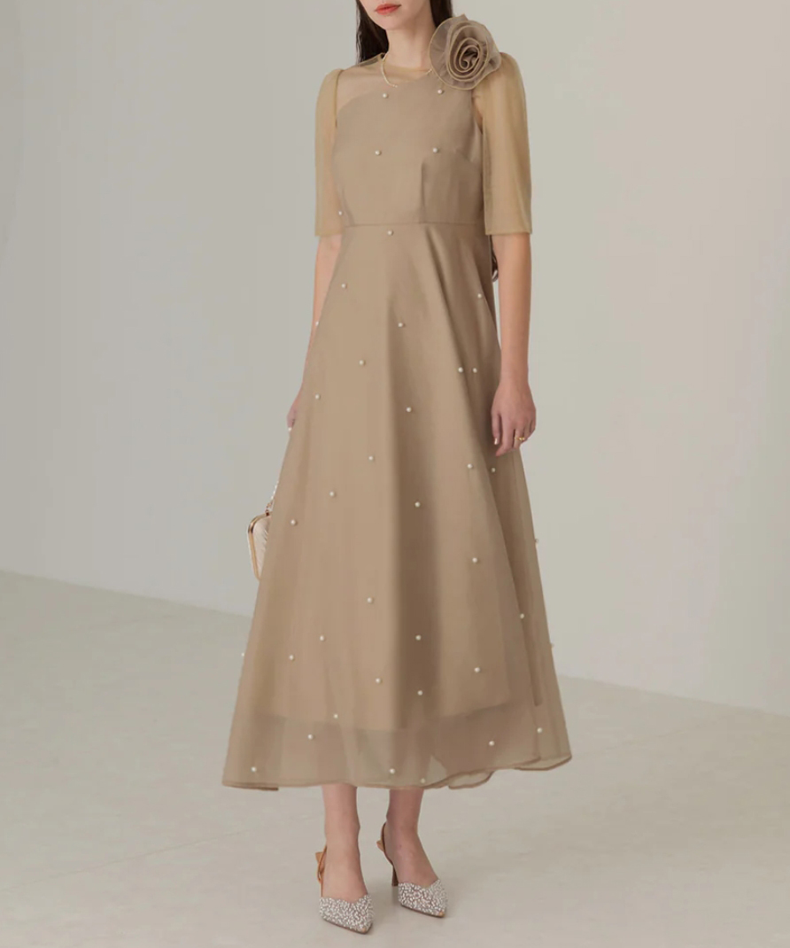 ふんだんに散りばめたパールとローズのモチーフが洗練された雰囲気を演出するAラインドレス。