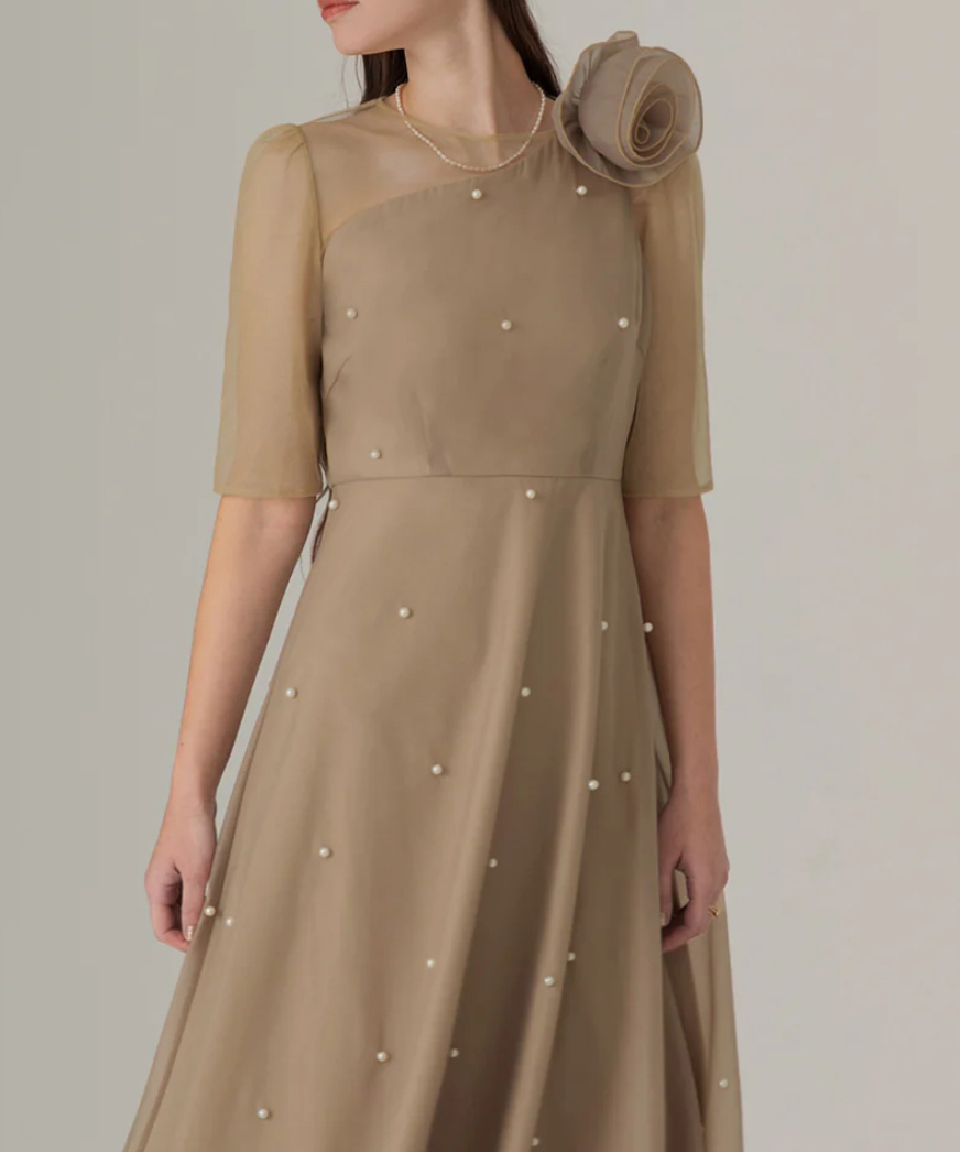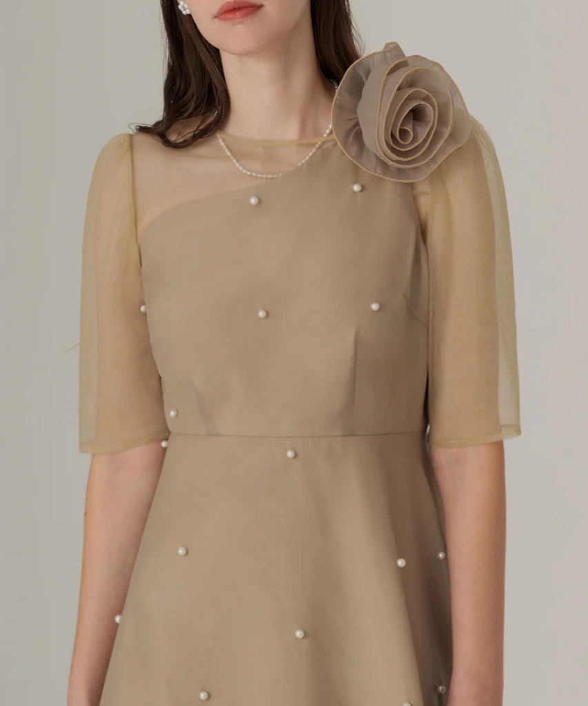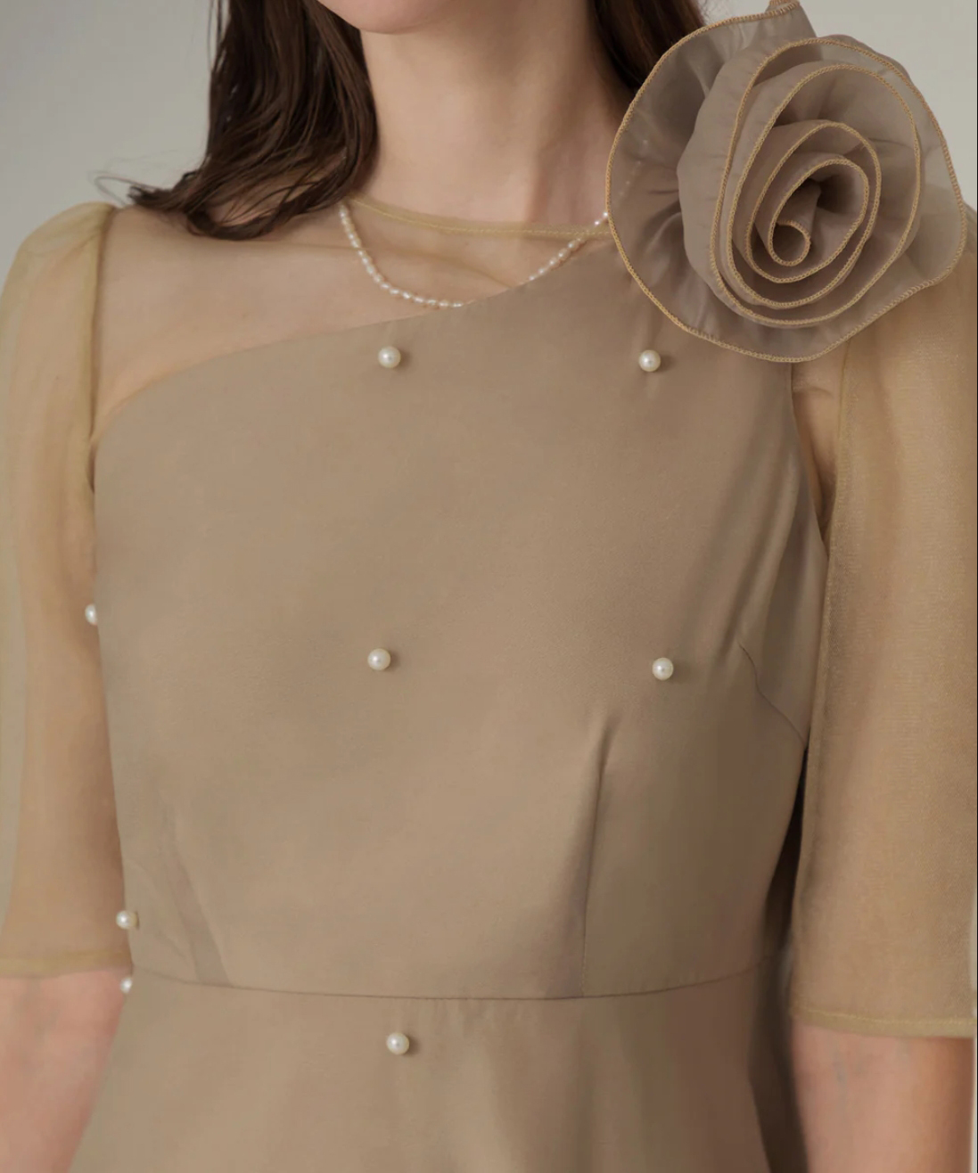 コサージュは取り外し可能となっており、ワンショルダー風のデザインが強調されモダンでスタイリッシュなスタイルに。